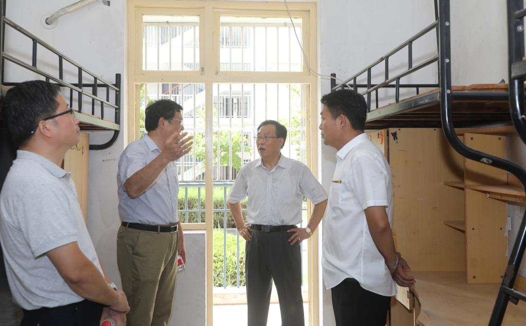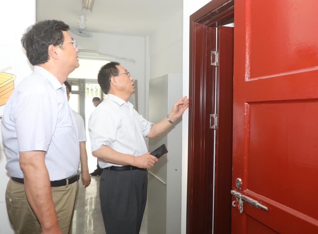在16栋等维修的学生宿舍内,胡朝荣认真察看了学生宿舍走廊墙壁、地板、水电、房间布局、通风采光、桌椅衣柜等情况,现场讨论并提出了具体改造意见,并不时打开手机手电筒,走进卫生间仔细检查有无漏水渗水情况。在学生宿舍新建洗浴房,胡朝荣要求施工单位一定要考虑周到、仔细,保障用水高峰期的热水供应,同时做好相关安全措施,确保学生足不出楼即可洗上温馨、安全、舒适的热水澡。