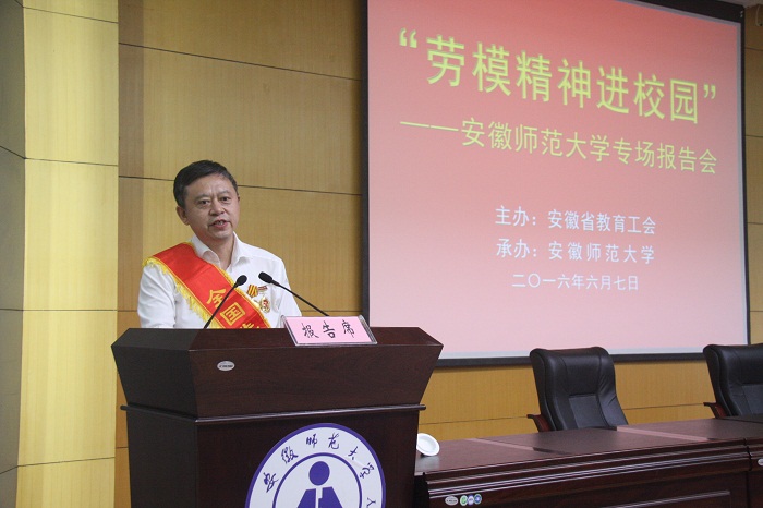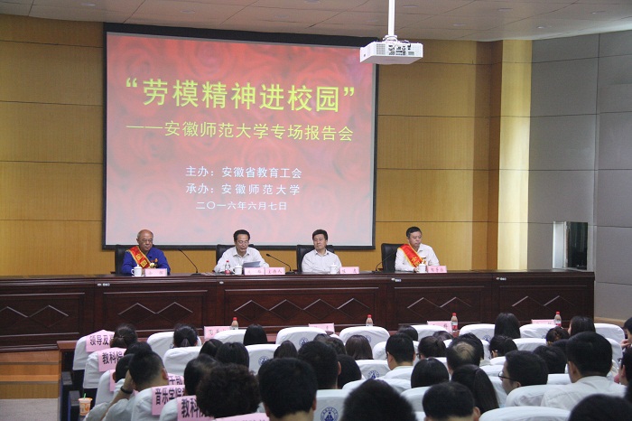 本网讯(党委宣传部 袁黎平)6月7日下午,由全国劳动模范、合肥燃气集团徐辉,全国先进工作者、安徽医科大学卫生管理学院教授陶芳标组成的省教育工会“劳模精神进校园”报告团来到我校举行专场报告会,安徽师范大学纪委书记程度、学校220名师生代表出席了报告会。报告会由安徽省教育工会主席凤桦主持。