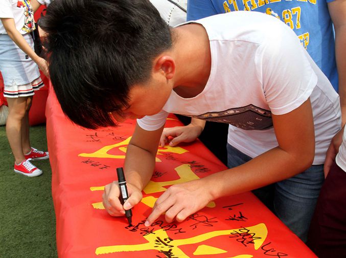 仪式结束后,全体新生跨越写有“迈入青春门,走好人生路”的彩虹门,在纪念横幅上签名留念,开启青春的征程。