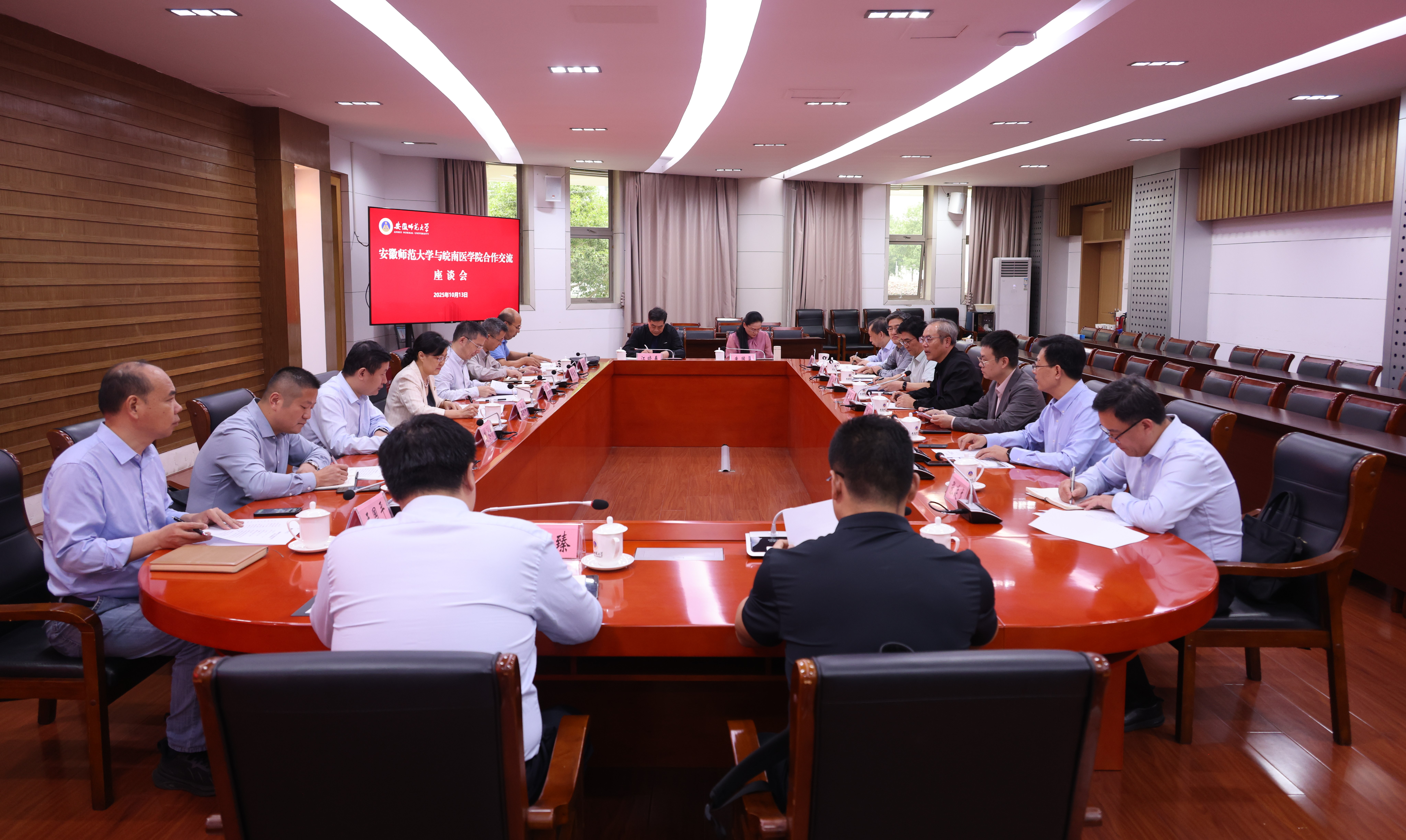 10月13日,皖南医学院党委书记夏劲松,党委副书记、院长姚应水,党委常委、副院长韩永升,党委常委、副院长余结根一行来校开展合作交流。校党委书记蒋家平,校党委副书记、校长熊宇杰,校党委常委、副校长高峰,校党委常委、副校长桑青松,校党委常委、办公室主任邵登辉,发展规划部、科研部、教育科学学院、生命科学学院主要负责同志参加座谈会。