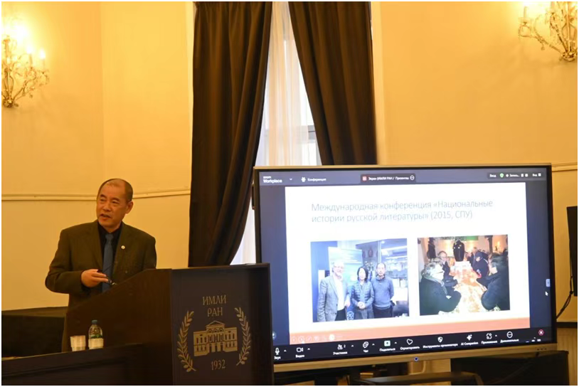 俄罗斯科学院历史与语文学部主任尼古拉·安德烈耶维奇·马卡罗夫主持证书授予仪式,他在发言中回顾了刘文飞教授的学术成就,以及在推动中俄两国人文交流方面的突出贡献。刘文飞教授就俄罗斯科学院外籍院士证书的授予发表致谢,并表示俄国文学研究如今在中国取得的壮丽景观是几代中国学者不懈努力的成果。随后,刘文飞教授作了题为《俄国文学史:中国视角》的学术报告。