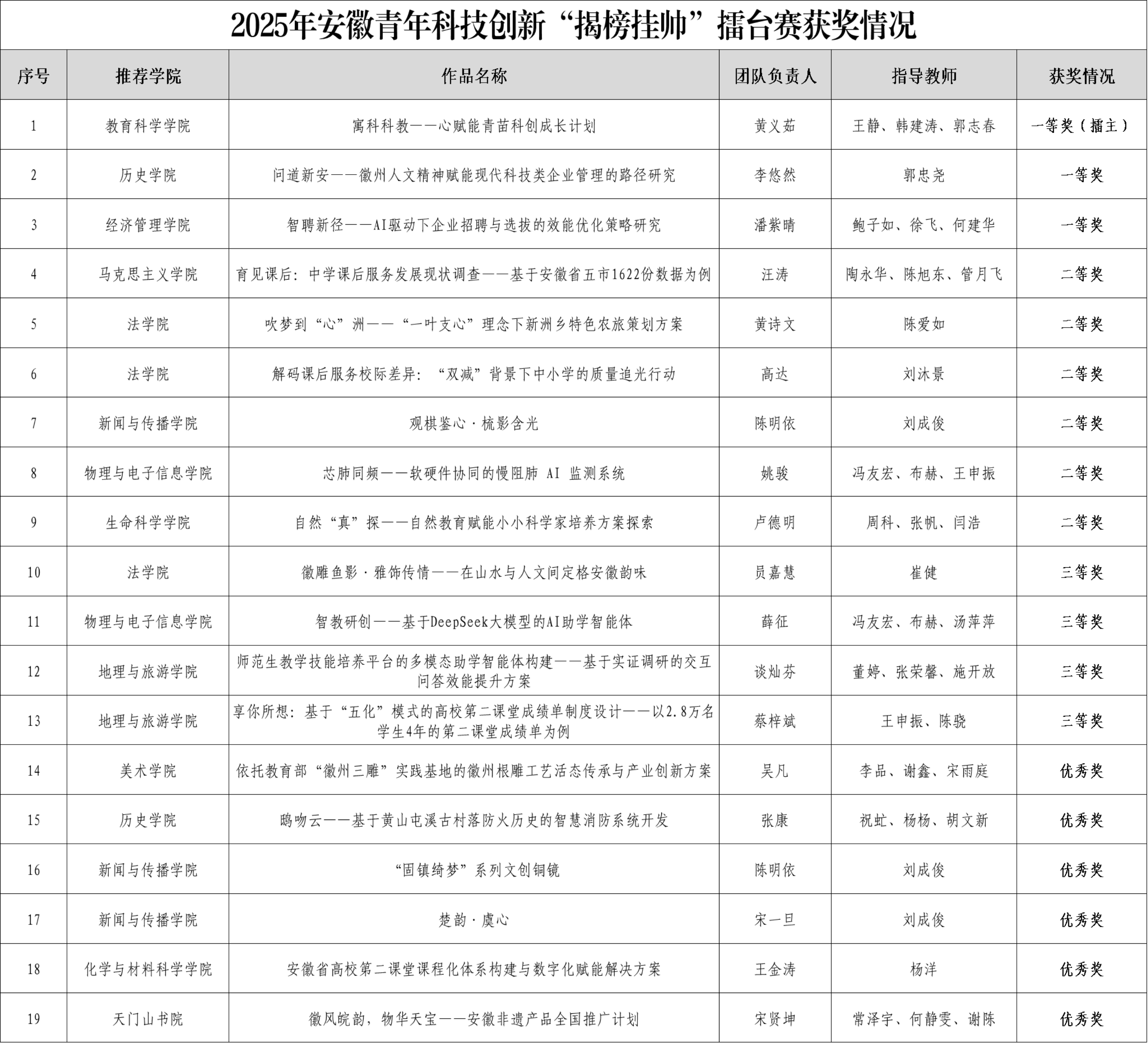 12月6日至8日,安徽青年科技创新“揭榜挂帅”擂台赛决赛落下帷幕。经终审决赛评审,我校获一等奖3项(其中“擂主”1个),二等奖6项、三等奖4项、优秀奖6项,学校总成绩居全省第二,获本届赛事“优秀组织奖”。团安徽省委副书记陈娟娟出席本届“揭榜挂帅”擂台赛闭幕式。