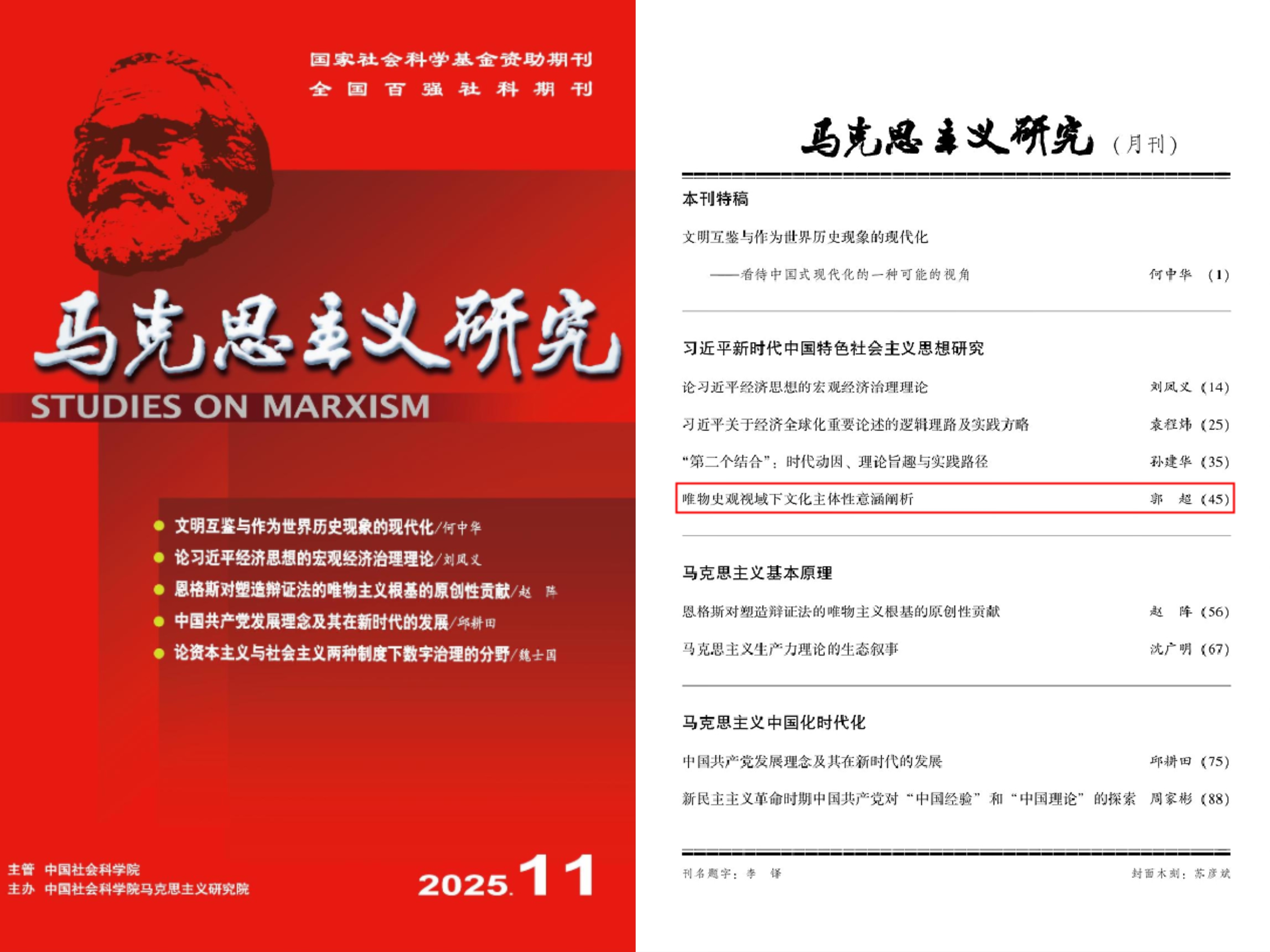 近日,马克思主义学院副教授郭超在马克思主义理论学科顶刊《马克思主义研究》(2025年第11期)发表理论文章“唯物史观视域下文化主体性意涵阐析”。