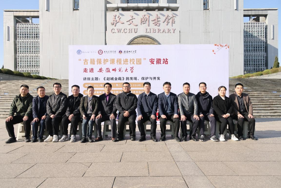 为深入贯彻落实中共中央办公厅、国务院办公厅印发《关于推进新时代古籍工作的意见》精神。12月9日上午,由国家图书馆(国家古籍保护中心)、安徽省图书馆(安徽省古籍保护中心)联合主办,安徽师范大学图书馆与团委共同承办的“古籍保护课程进校园”活动在我校花津校区敬文图书馆举行。校党委常委、副校长王刚,安徽省古籍保护中心主任、安徽省图书馆党总支书记、馆长左金刚,以及来自芜湖市图书馆、安徽中医药大学图书馆等单位的领导专家与300余名师生代表参加了活动。活动仪式由校图书馆党总支书记姜长付主持。