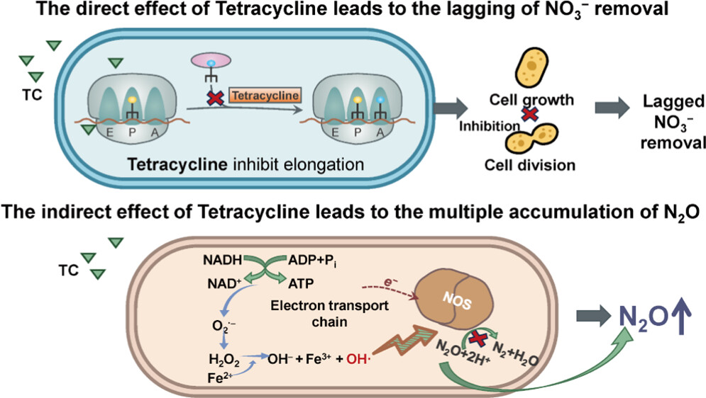 抗生素在环境中的检出越来越多,威胁着微生物介导的氮循环。然而,亚抑制浓度的核糖体靶向抗生素影响反硝化作用和氧化亚氮(N₂O)排放的细胞机制尚不清楚。研究团队以模式反硝化菌——Paracoccus denitrificans为对象,系统评估了环境相关浓度核糖体靶向抗生素四环素(TC)对脱氮过程与细胞生理的影响。结果表明,TC在不显著引起细胞死亡的情况下延缓了硝态氮的去除,显著增加了N₂O的排放。酶活性测定发现TC对反硝化酶的抑制是普遍和非特异性的,而细胞生理和转录组学分析发现碳代谢和电子传递受到干扰。综合证据表明,TC通过抑制蛋白质合成和葡萄糖利用,并损害电子传递,导致细胞内氧化还原失衡和活性氧(ROS)积累。而抗生素作用下细胞内源产生的ROS通过优先抑制N₂O还原酶活性,导致了N₂O的积累。