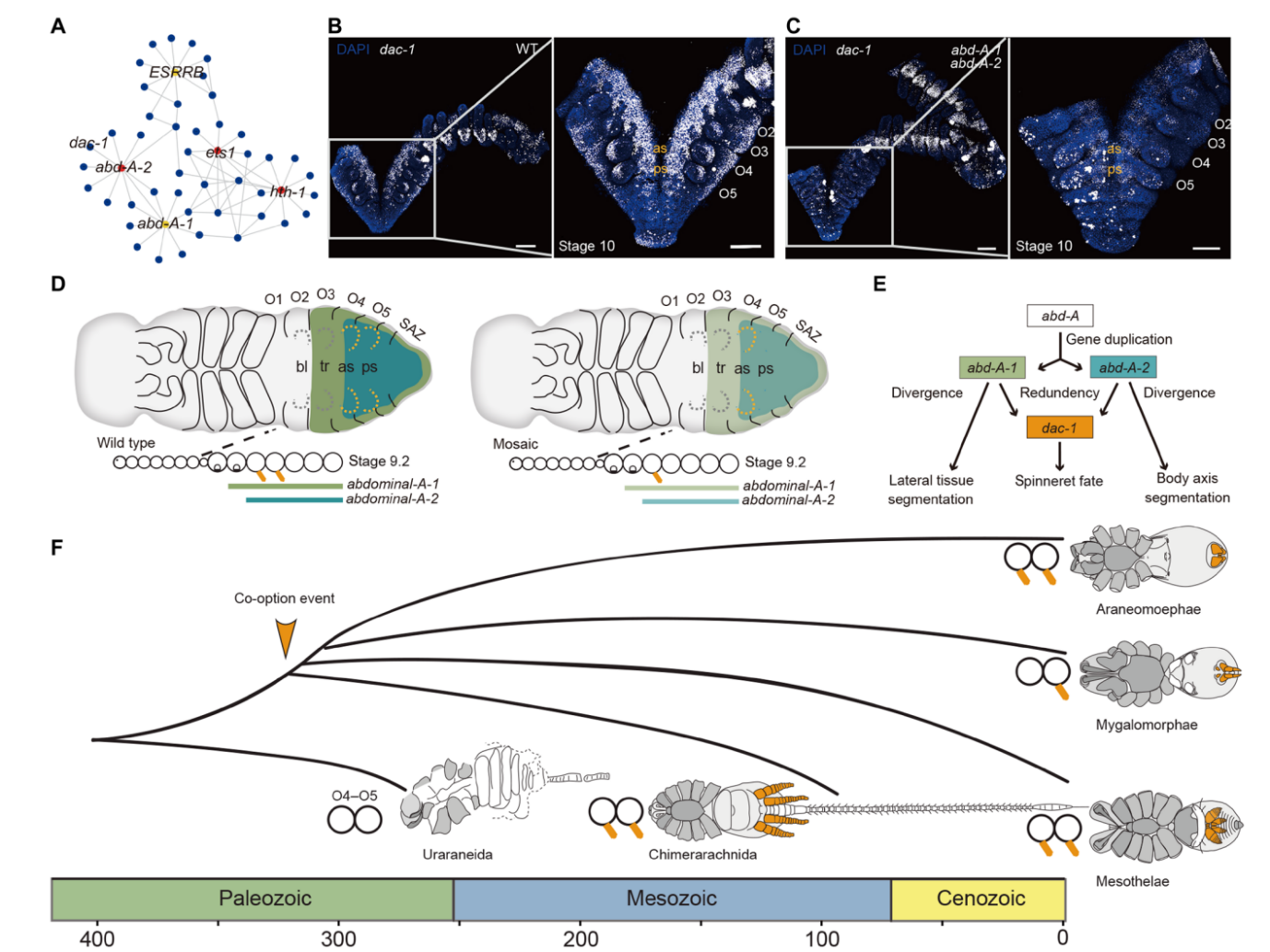 本研究利用多组学技术以及系统全面的验证手段,发现了abdominal-Aabd-A)基因的两个拷贝共同促进蜘蛛纺器的形成,并进一步招募肢体建造基因dachshund dac-1)参与纺器的精细构建。该研究不仅揭示了蜘蛛纺器这一关键适应性结构的发育与演化机制,也为后续基于纺器生物学原理的仿生材料构建提供了重要的理论依据。