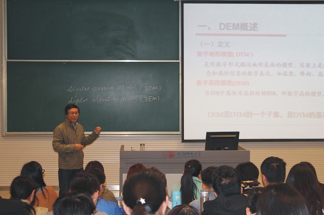 授课伊始,程先富教授带领同学们回顾了上节课的主要内容,用回顾知识点的方式切入本次授课内容——数字地形模型分析。程老师阐述了数字地形模型的发展,从DEM概述、DEM之间的相互转换、DEM的数据采集三个方面图文并茂地剖析了数字地形模型。授课过程中,程老师语言精练、条理性强、板书与多媒体教学良好结合,体现了娴熟的教学技能和深厚的教学基本功,同时在教学过程中注重引用最新研究前沿,拓展了学生视野,调动了学生学习的主动性和积极性。
