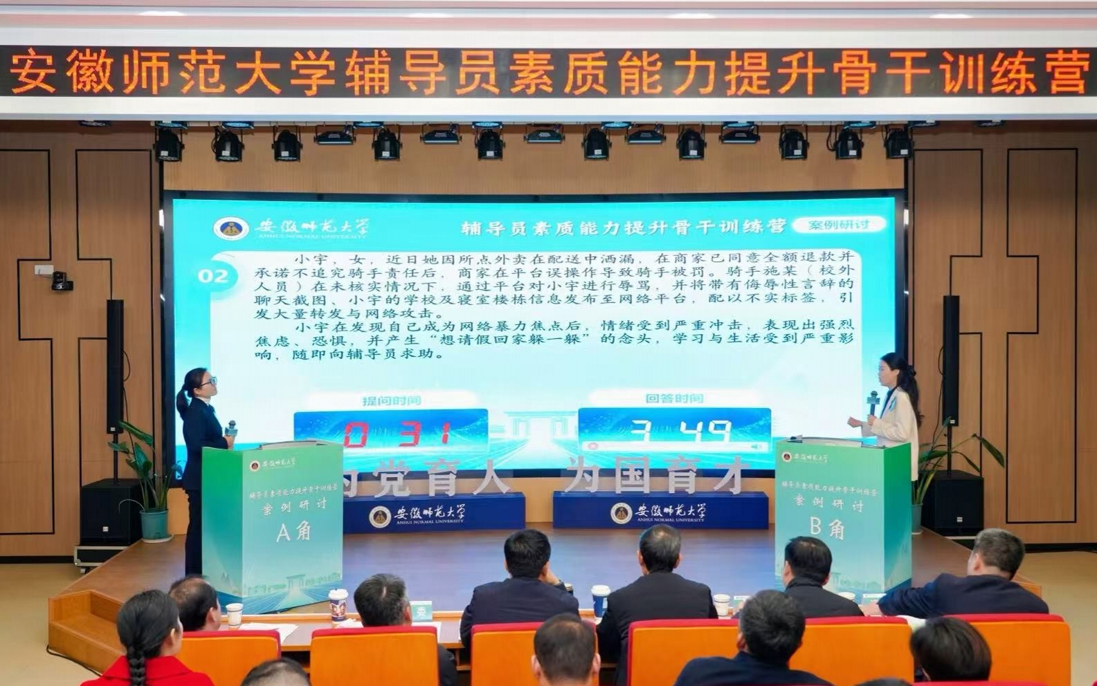 在案例研讨环节,选手们围绕“学业危机应对”“网络舆情处置”“就业焦虑疏导”等高校学生工作中的现实难题,现场抽题、即时作答,考验了系统思维与应急处置能力;谈心谈话环节则通过情景模拟,还原学生面临思想困惑、发展迷茫时的真实场景,选手们需在交流中实现情感共鸣与价值引领,展现“有温度的教育”。评委团针对选手的答题思路、应对方法进行现场提问,并从“专业性、针对性、人文关怀”等多维度综合评分,点评精准且富有指导性。
