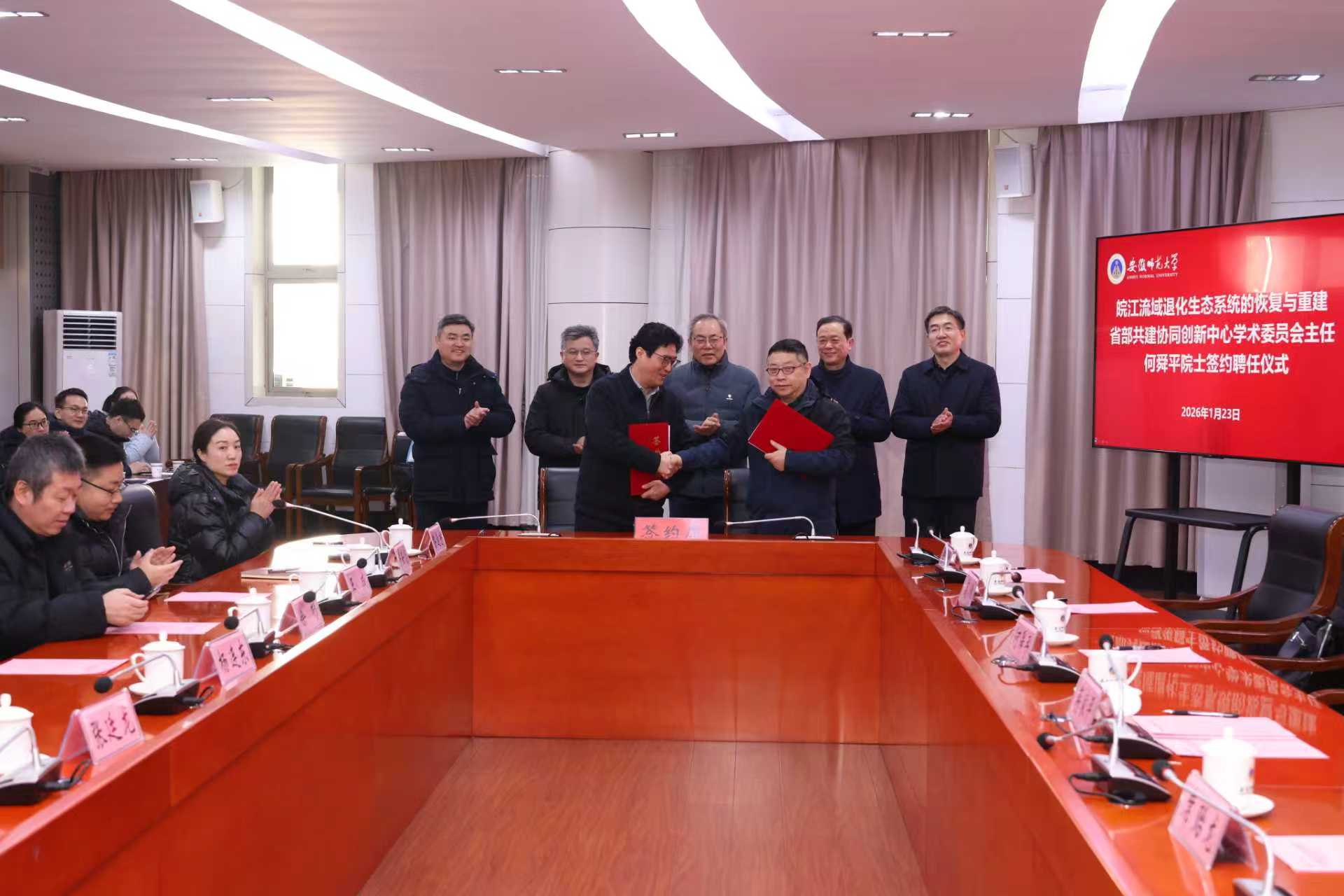 1月23日上午,“皖江流域退化生态系统的恢复与重建”省部共建协同创新中心(以下简称“中心”)学术委员会主任何舜平院士聘任仪式在我校花津校区会议中心举行。校党委书记蒋家平,校党委常委、副校长高峰出席仪式,中国科学院水生生物研究所杨连东研究员、王成助理研究员,学校相关职能部门负责人、生态与环境学院党政领导班子、教师代表参加仪式。仪式由人事处处长李宜江主持。