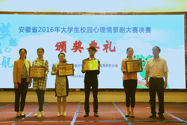 本网讯(学工处 文/沈艳红 图/金凤仙)6月4日,全省大学生校园心理情景剧决赛在合肥举行。我校选送的新传学院参赛剧目《藤出新蔓》荣获大赛“一等奖”,学校荣获“优秀组织奖”。省教育厅学生处处长左其琨亲临活动现场并为获奖剧目代表和优秀组织奖高校颁奖。