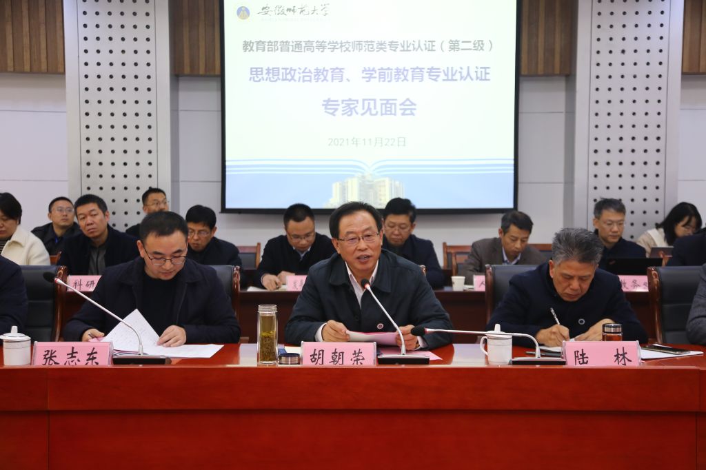 胡朝荣对专家组一行来校表示欢迎和感谢,他简要介绍了学校办学历史、基本情况和发展定位。胡朝荣指出,我校作为安徽高等教育的“母体”和基础教育的“母机”,高度重视师范专业认证工作,把抓好专业认证作为建设一流本科专业、提升师范生培养质量、打造鲜明办学特色的重要契机、关键抓手和必由之路。此次认证是我校开展的第五批二级认证,思想政治教育和学前教育是我校两个传统优势师范专业,这次专家进校考查,既是对这两个专业“体检把脉”,更是给我们“传经送宝”,对我们办好一流师范专业、建设高水平师范大学具有非常重要的指导意义。