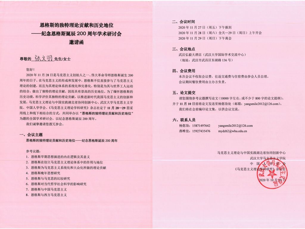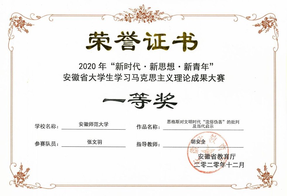 张文羽作为项目第一负责人以《公共危机情境下网络情绪表达与治理调研报告》成功申报大学生创新创业训练计划项目并获国家级立项。在项目申报以及后续操作的过程中,面对瓶颈障碍,她毫不畏惧,直面难题,勇于突破技术难题,学习并熟练掌握了ROSTCM6软件的运用,助力项目的顺利进行。2020年正值恩格斯诞辰两百周年之际,她撰写了《恩格斯对文明时代“流俗伪善”的批判及其当代启示——基于<家庭、私有制和国家的起源>的文本分析》一文,在2020年安徽省大学生学习马克思主义理论成果大赛中荣获一等奖,这篇文章将发表于中国社会科学院大学主办的《青年马克思主义研究》首期。此外,她还用该文投稿参加了由武汉大学等单位联合主办的恩格斯的独特理论贡献和历史地位——纪念恩格斯诞辰200周年学术研讨会。