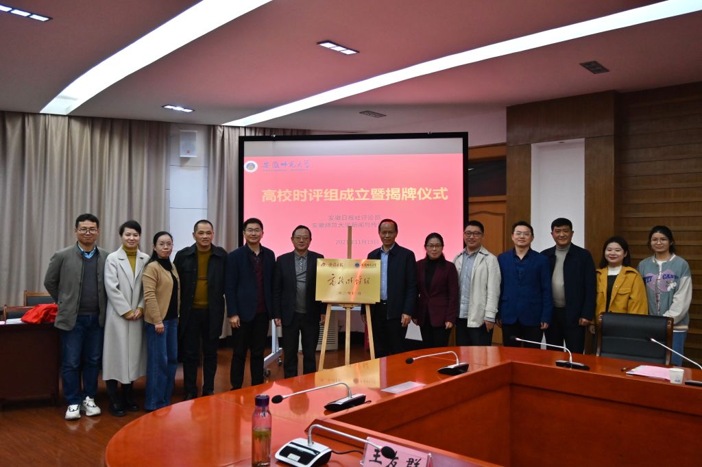 本网讯(新闻与传播学院 韩钰 姜乐融 符玉娟)11月19日,“高校时评组”成立揭牌暨院媒协同育人座谈会在我校举行。安徽日报评论部主任曹显钰与新闻与传播学院执行院长杨柏岭共同为“高校时评组”揭牌,这标志着今年1月起实质性运作的高校时评组正式成立。校党委宣传部负责同志、新传学院领导班子、师生代表和高校时评组全体成员参加仪式,新闻与传播学院副院长马梅主持。