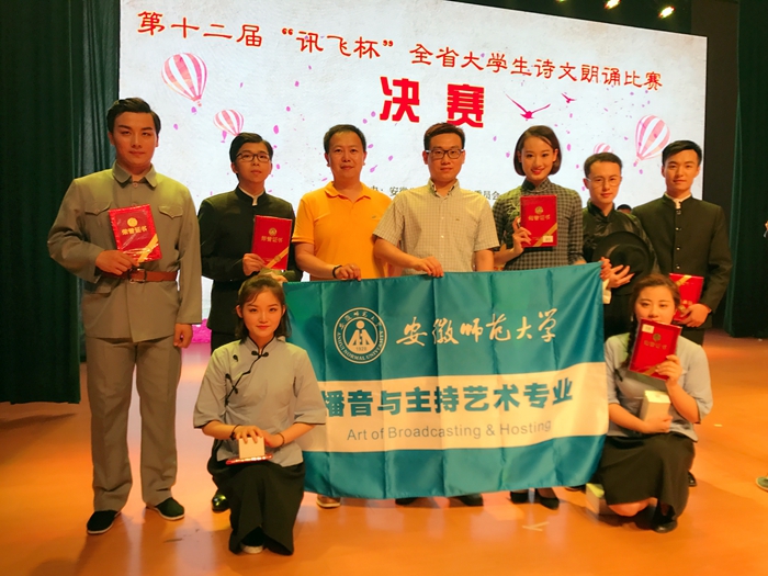 本网讯(新闻与传播学院)2017年6月3日,第十二届“讯飞杯”全省大学生诗文朗诵比赛在安徽大学落下帷幕。我校播音与主持艺术专业郭雅迪、陶钧、李论、陈喆彧、阮从青、王可欣朗诵的作品《革命组诗》荣获专业组唯一一等奖,邵振奇、孙炜峰获得优秀指导教师奖。这是我校播音学子参加该项赛事六年来获得的第六次最高奖,充分体现出我校播音专业的办学成果和人才培养质量。