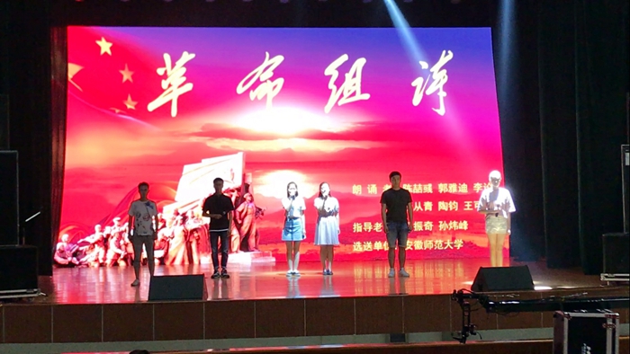 我校接到安徽省教育厅通知后,第一时间完成了参赛学生的遴选工作,与此同时,新传学院播音专业学生的参赛热情空前高涨,邵振奇、孙炜峰作为本次参赛作品的指导老师,夜以继日,完成了高强度的排练任务。不仅引导学生认识稿件背景、推敲情感表达、编排作品形式,还与王恒乾老师一同完成了初赛音频的制作。最终,《革命组诗》、《木兰辞》在全省高校选送的263件作品中脱颖而出,成功挺进决赛。在决赛的舞台上,选手泰然自若、发挥稳定,以高超的朗诵技巧、细腻的情感表达,赢得了评委的一致称赞。最终,由郭雅迪等同学朗诵的《革命组诗》以97.88分的成绩问鼎大赛专业组唯一一等奖,由陈紫豪同学朗诵的《木兰辞》获得专业组三等奖。