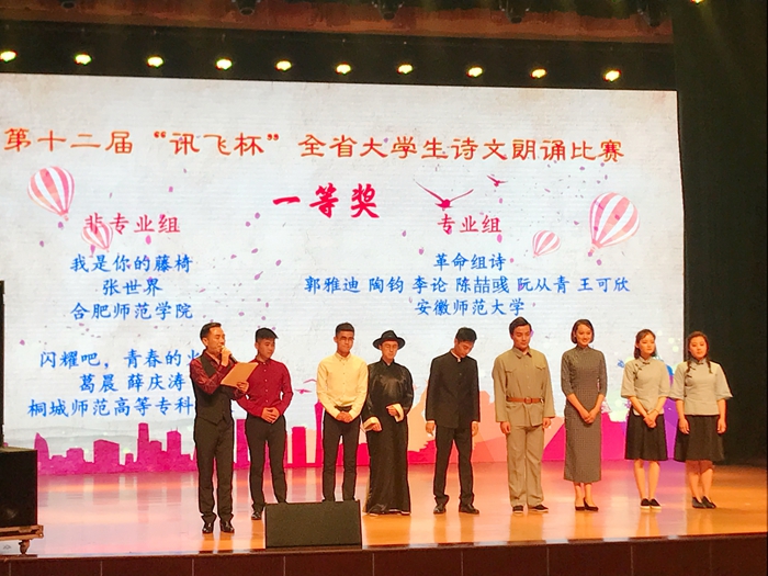 “讯飞杯”安徽省大学生诗文朗诵比赛自2006年开办以来,已成功举办十二届。本届比赛由安徽省语言文字工作委员会、安徽省教育科学研究院、安徽省朗诵艺术学会、安徽省普通话培训测试中心主办,安徽大学承办。该项赛事为提高大学生艺术素养和综合素质搭建了平台,为宣传社会主义核心价值观、弘扬优秀文化传统提供了重要阵地。