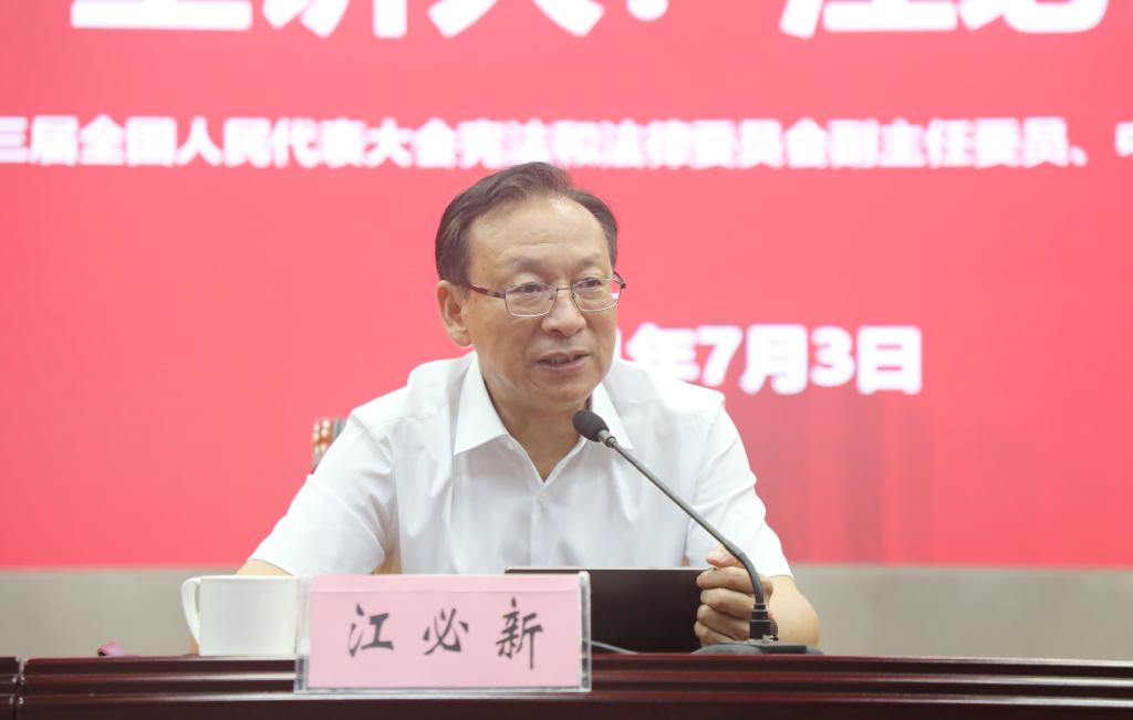 本网讯(党委宣传部 王哲谦)7月3日上午,学校在花津校区理科实训大楼报告厅举办党史学习教育专题读书班专家报告会,邀请第十三届全国人民代表大会宪法和法律委员会副主任委员、中国法学会副会长江必新作题为《习近平法治思想的理论构成》的专题报告。我校79级校友、中国法学会案例法学研究会会长、原最高人民法院审判委员会副部级专职委员胡云腾出席报告会,校党委书记胡朝荣主持报告会。在校校领导,全校处级以上领导干部,党史学习教育领导小组、指导组成员和师生代表300余人参加报告会。