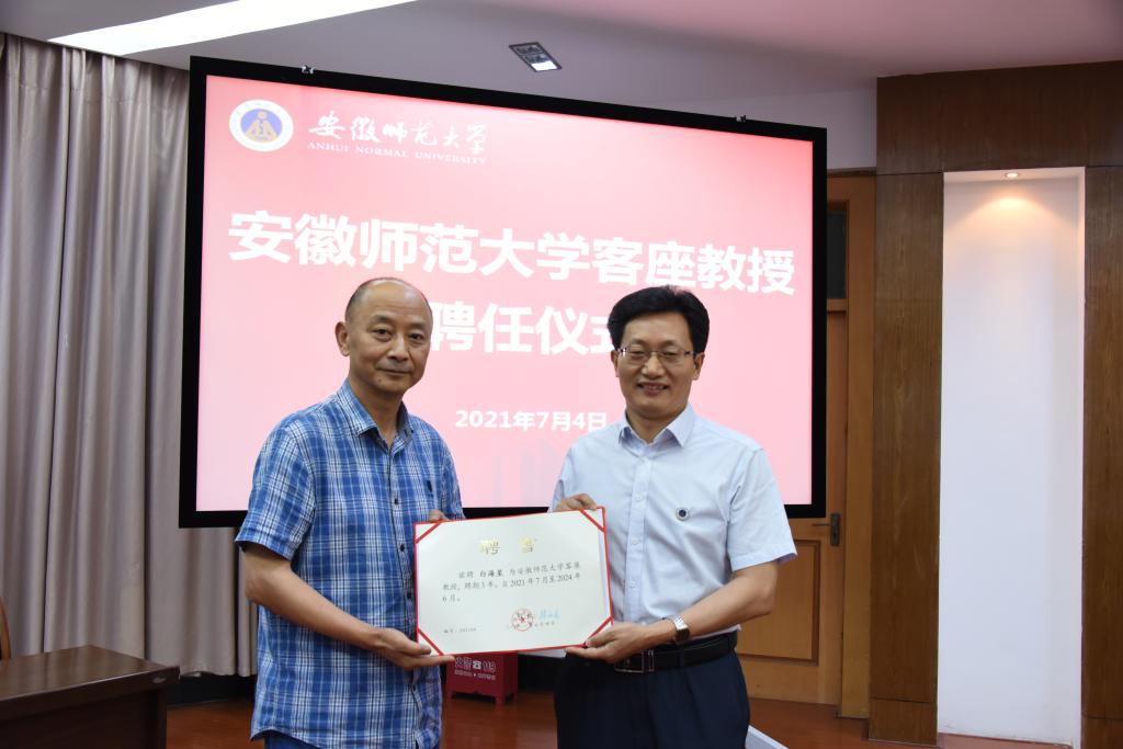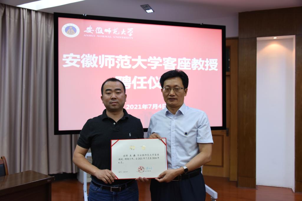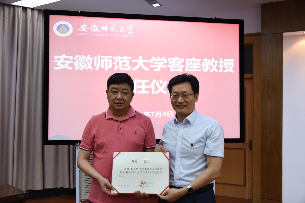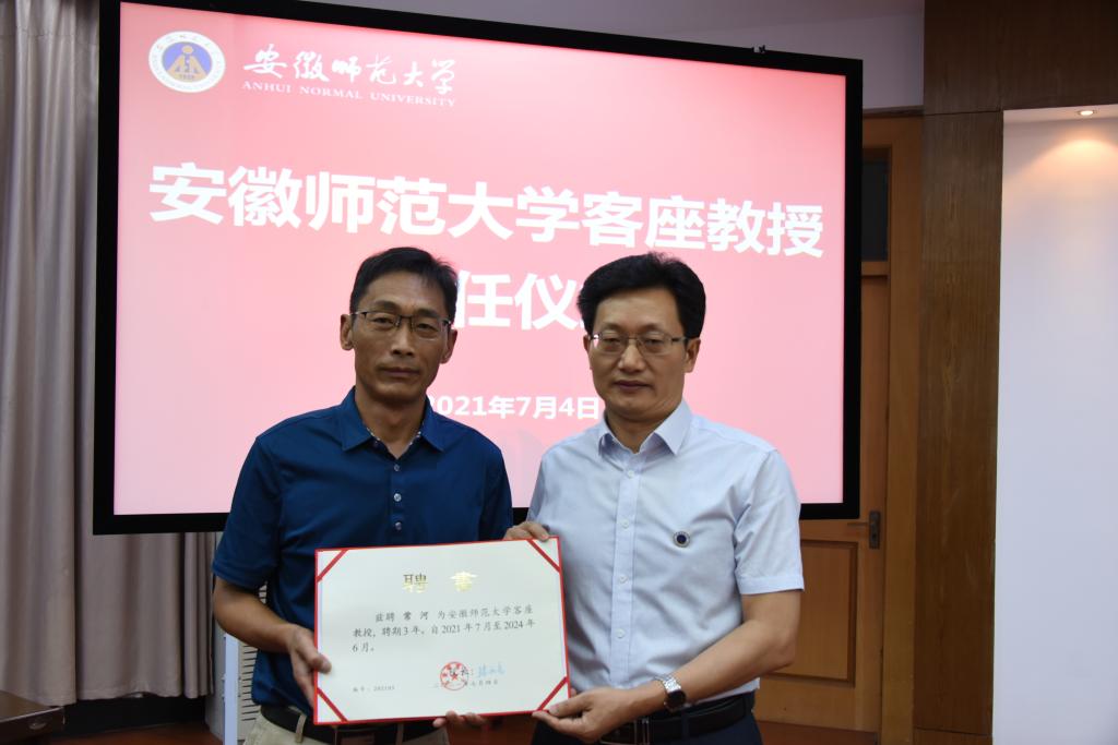 本网讯(新闻与传播学院 文/马梅 图/肖雨蒙)7月4日,中央驻皖媒体客座教授授聘仪式在花津校区圆形报告厅一楼举行。校党委副书记、校长张庆亮为光明日报社安徽记者站站长常河、经济日报社安徽记者站站长白海星、科技日报社安徽记者站站长吴长锋、中国青年报社安徽记者站长王磊等4位站长颁发客座教授聘任证书并佩戴安徽师范大学校徽。校党委副书记蒋家平、党委宣传部常务副部长王刚、人事处处长朱为民、新闻与传播学院党政班子成员、教授委员会主任委员和师生代表等参加仪式。