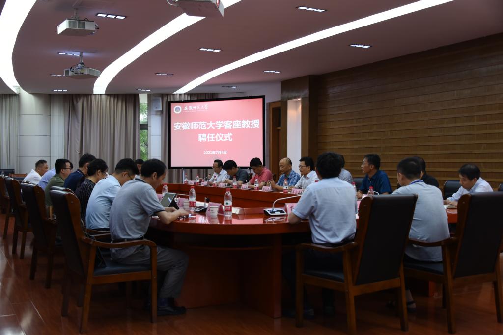 仪式上,张庆亮向中央驻皖媒体和4位站长对学校事业发展的关心和支持表示衷心感谢。张庆亮指出,聘用客座教授是我校人才建设的重要举措,当下我校正在发展的关键阶段,学校要以更加开放的思路吸纳社会上的优秀人才,为人才培养提供更加优质的教学资源,为我校的百年学府建设提供更加坚实的保障。蒋家平表示,新闻传播教育要走向社会、走向实践,客座教授能够提升学生的思想水平、业务能力,使得师大学子拥有更加长远的眼光,助力新闻与传播学院更好开展马克思主义新闻观教育教学工作。