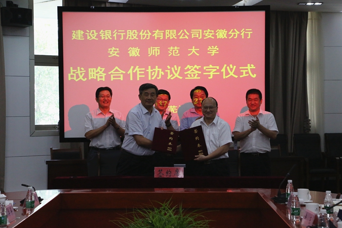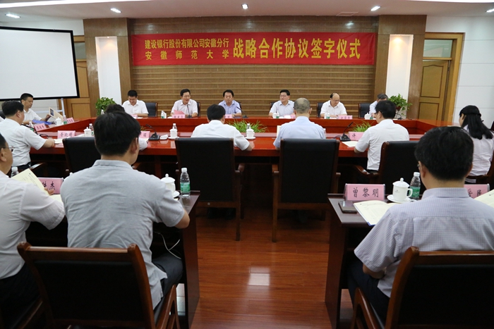 本网讯(财务处 宣传部) 8月21日下午,安徽师范大学与中国建设银行股份有限公司安徽省分行的“战略合作协议”签约仪式在花津校区会议中心第一会议厅隆重举行。建行安徽省分行党委书记、行长戴跃明,党委副书记、副行长方华平,我校党委书记顾家山、副校长王绍武以及学校办公室、发展规划处、财务处、信息管理中心、继续教育学院、图书馆等单位负责同志出席签字仪式,校长张庆亮主持签字仪式。
