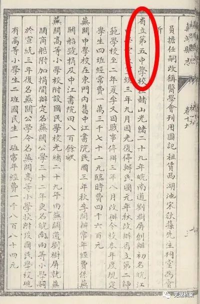 (图为民国八年《芜湖县志》记载“省立第五中学”)