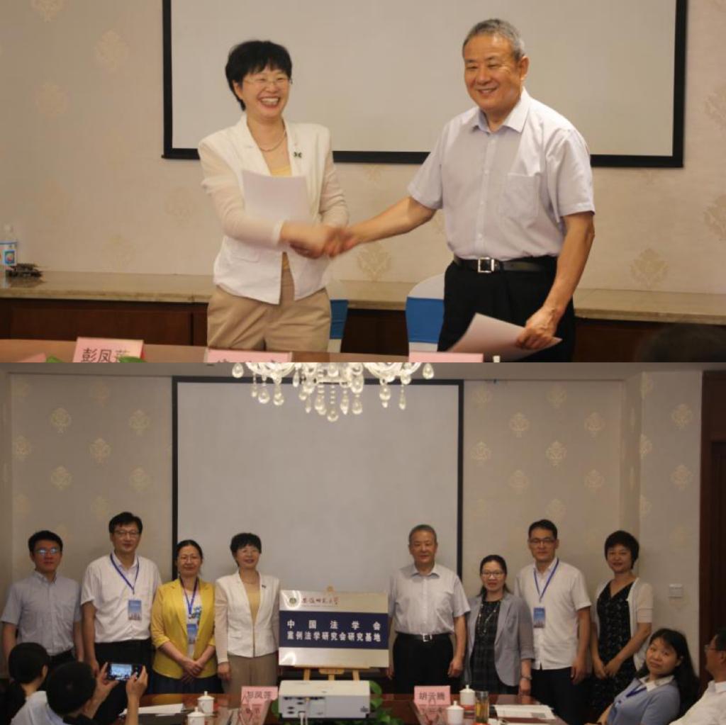 研究会秘书长梁欣宣读了《中国法学会案例法学研究会关于在安徽师范大学设立研究基地的决定》。研究会会长胡云腾教授、安徽师范大学副校长彭凤莲教授代表双方签署了《中国法学会案例法学研究会与安徽师范大学法学院共建研究基地协议书》,共同为中国案例法学研究会安徽师范大学研究基地揭牌。