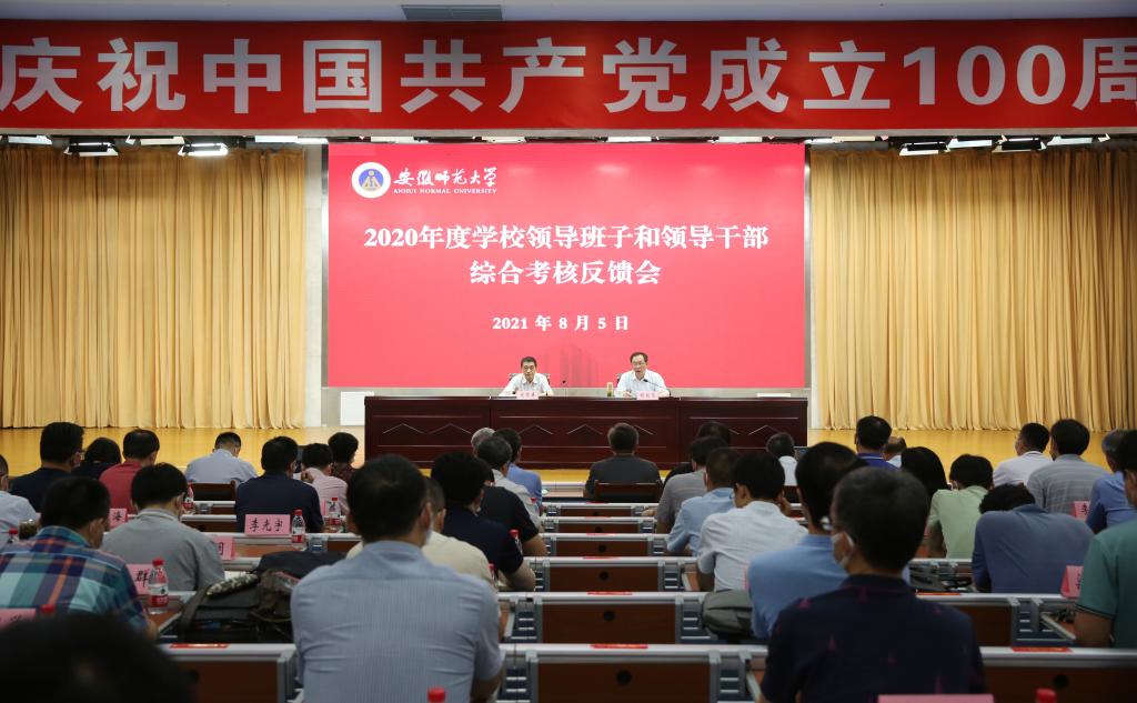 宛晓春代表考核组介绍了今年4月份省委第十五考核组来校实地考核总体情况,从党的建设、领导班子发展考核两个方面肯定了安徽师范大学取得的各项成绩,对学校领导班子给予高度评价,并针对考核中存在的问题和不足提出了整改意见和建议。考核组认为,2020年,安徽师范大学领导班子在党建工作中思想政治工作常抓不懈,党委核心领导作用得到进一步加强,基层党组织建设进一步提升,干部队伍建设平稳推进;在推进事业发展中人才培养工作稳中有进,师资队伍建设持续提升,科研水平和社会服务能力有新提升,国际交流合作成效明显。班子能够以习近平新时代中国特色社会主义思想为指导,深入贯彻落实党的十九大和十九届二中、三中、四中、五中全会精神,认真学习贯彻习近平总书记考察安徽重要讲话指示精神和关于教育的重要论述,统筹抓好疫情防控和教育教学,一体推进全面从严治党和高水平大学建设,在巡视反馈问题整改、学科建设、人才培养、科技创新方面取得一定成绩,确定安徽师范大学为“优秀”班子,校党委书记胡朝荣,党委副书记、校长张庆亮同志为“优秀”等次。
