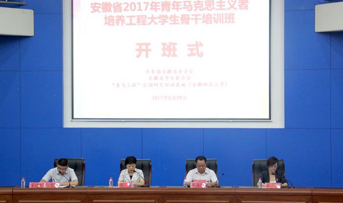 青通社讯(文/魏鑫鑫 图/左德峰 凌蔚强)8月29日上午,2017年安徽省青年马克思主义者培养工程大学生骨干培训班开班式在安徽师范大学敬文图书馆一楼国际学术交流中心举行,团省委副书记张敏、校党委副书记李琳琦出席开班式并讲话,团省委学校部、我校团委负责同志以及来自全省105所高校的241名大学生骨干代表参加开班式。开班典礼由团省委学校部副部长马志华主持。