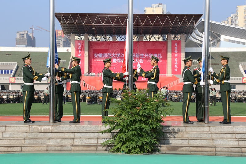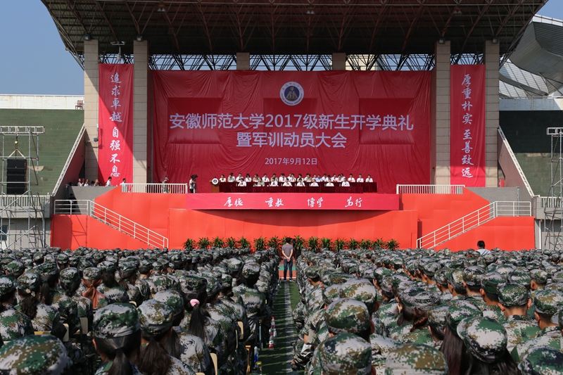 “安徽师范大学2017级新生开学典礼暨军训动员大会”字样,写有“厚重朴实、至善致远、追求卓越、自强不息”师大精神的横幅竖立在主席台两侧,主席台下方“厚德、重教、博学、笃行”校训格外引人注目。观礼台两边巨幅标语:“青春梦师大梦中国梦,新起点新征程新辉煌”催人奋进。一排绿色的植物盆栽一字排开,在红色背景的映衬下尤其绿意盎然、生机勃勃。