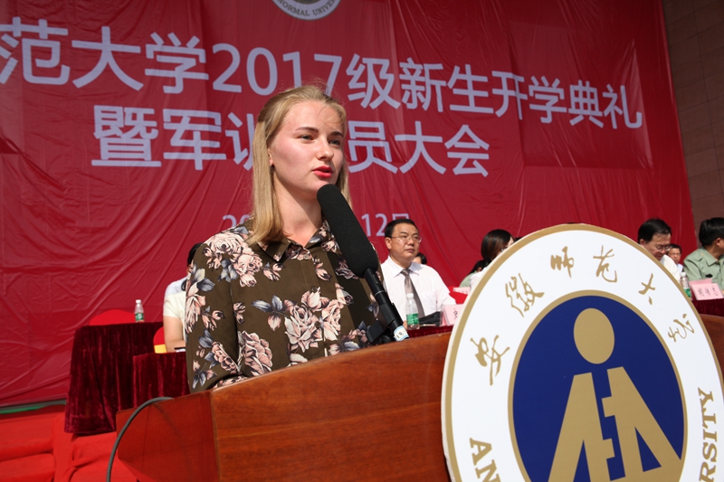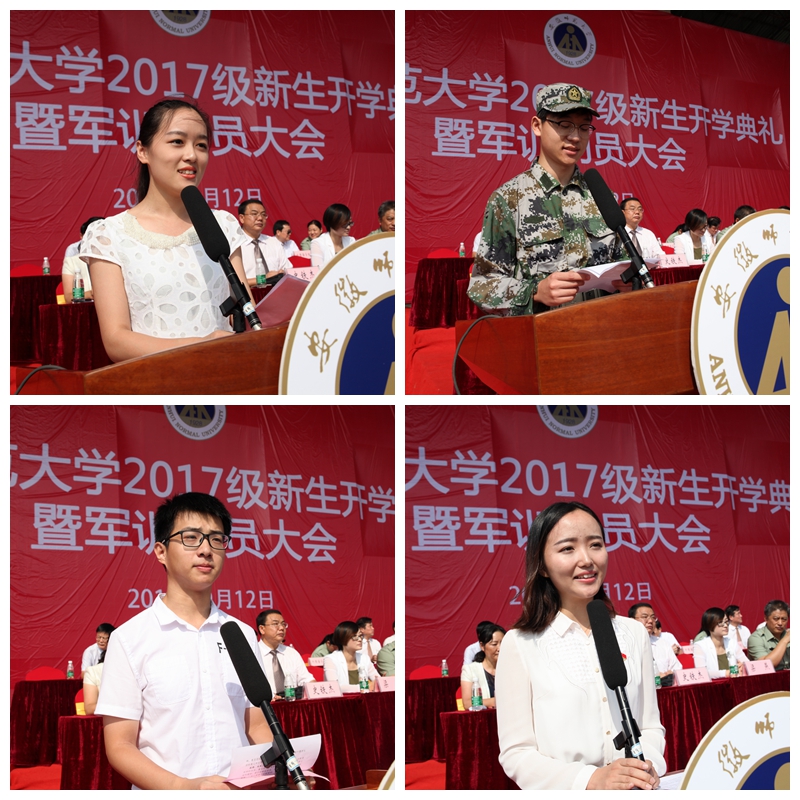 本科生新生代表、新闻与传播学院中英新闻专业季行健,研究生新生代表、化学与材料科学学院化学专业董若浩,留学生新生代表、来自乌克兰的林雨菲,本科生老生代表、经济管理学院2014级经济学专业张永秀,研究生老生代表、国土资源与旅游学院2015级旅游管理专业吴燕同学分别作了发言。他们怀着对大学生活的憧憬和对未来的希望,以坚定有力的话语表达了圆梦师大、荣耀母校的愿望,表示将继续努力奋斗,传承师大精神,用激情燃烧无悔青春,用汗水书写美好明天,用实际行动为母校90年华诞和党的十九大胜利召开贡献力量。