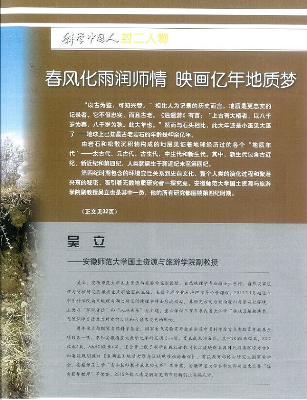 本网讯(国旅学院 刘冠琪、李海霞)近日,由中国科协主管、中国科技新闻学会主办的高层次科普杂志《科学中国人》以《春风化雨润师情,映画亿年地质梦》为题,专题采访了我校国旅学院青年教师吴立副教授,并将其作为杂志(2017.7上)封二人物刊登。吴立老师于2003年至2010年在我校国旅学院就读地理科学本科和自然地理专业硕士研究生,2013年博士毕业于南京大学地理与海洋学院,2017年1月进入中国科学院南京地理与湖泊研究所地理学博士后流动站,现为安徽师范大学国土资源与旅游学院副教授、自然地理学专业硕士研究生导师,主要研究方向为湖泊沉积与第四纪环境,任教期间,科研与学术并重,硕果累累。