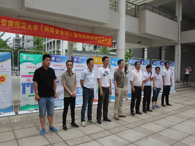 本网讯(信息管理中心 法学院)2017年6月1日,《中华人民共和国网络安全法》正式施行。为加强我校法治文明建设,提高学生网络安全意识,安徽师范大学信息中心与法学院在大学生活动中心举办《网络安全法》宣传系列活动启动仪式。校信息管理中心主任史铁杰、副主任李士松,法学院党委副书记屈光峰出席仪式,参加仪式的还有信心管理中心和法学院师生代表,仪式由屈光峰主持。