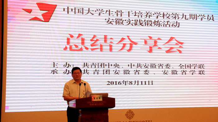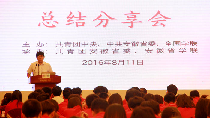 青通社讯(校团委 陈 骁)8月11日,中国大学生骨干培养学校第九期学员安徽实践锻炼活动总结分享会在我校举行。团中央学校部部长杜汇良、全国学联主席王圣博、团安徽省委副书记杨正、校党委书记顾家山出席分享会。来自北京大学、清华大学等全国200余所高校的学生会、研究生会骨干分享了来皖11天的实践锻炼成果,形式丰富、内容深刻、朝气蓬勃。