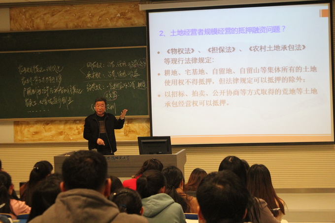 授课伊始,程久苗教授带领同学们回顾了上节课的主要内容,用回顾知识点的方式切入本次授课内容——土地承包经营权流转。程久苗教授阐述了农村土地流转相关概念、背景,从土地所有权、土地承包权、土地经营权三个方面图文并茂地剖析了当前农村土地“三权”分置的内涵。授课过程中,程久苗教授语言精练、条理性强、板书与多媒体教学良好结合,体现了娴熟的教学技能和深厚的教学基本功;同时在教学过程中注重引用最新研究前沿,拓展了学生视野,调动了学生学习的主动性和积极性。