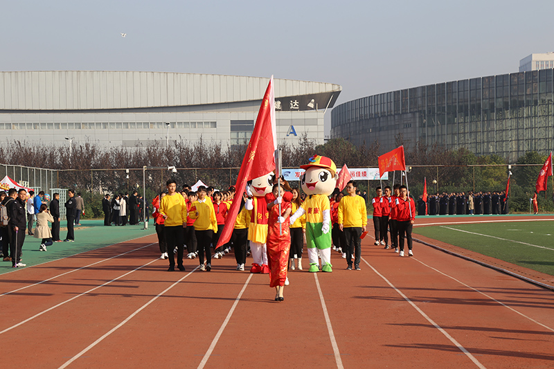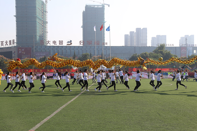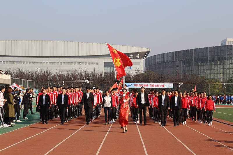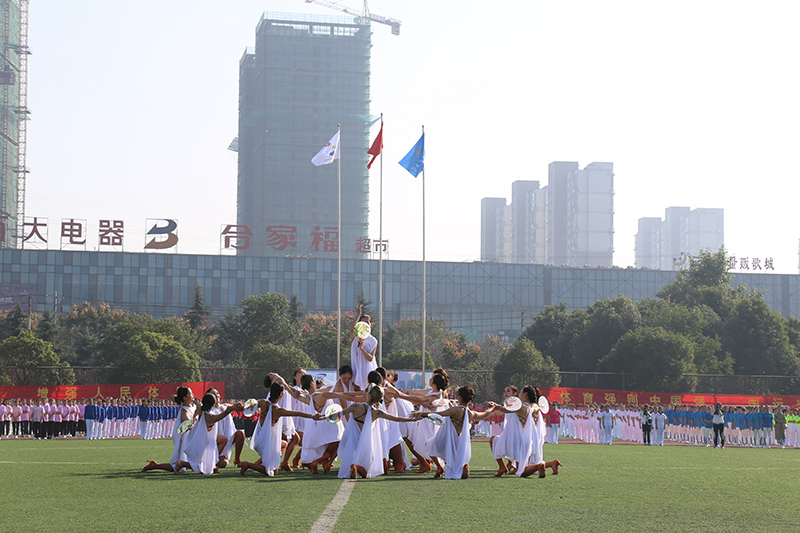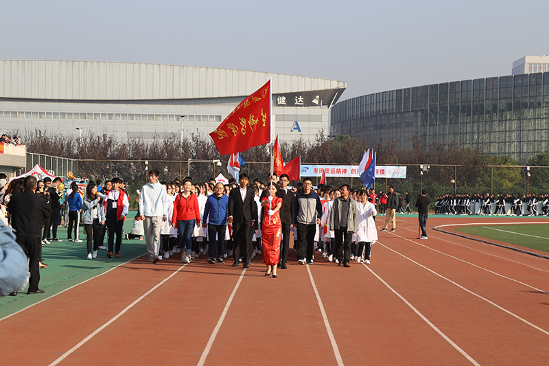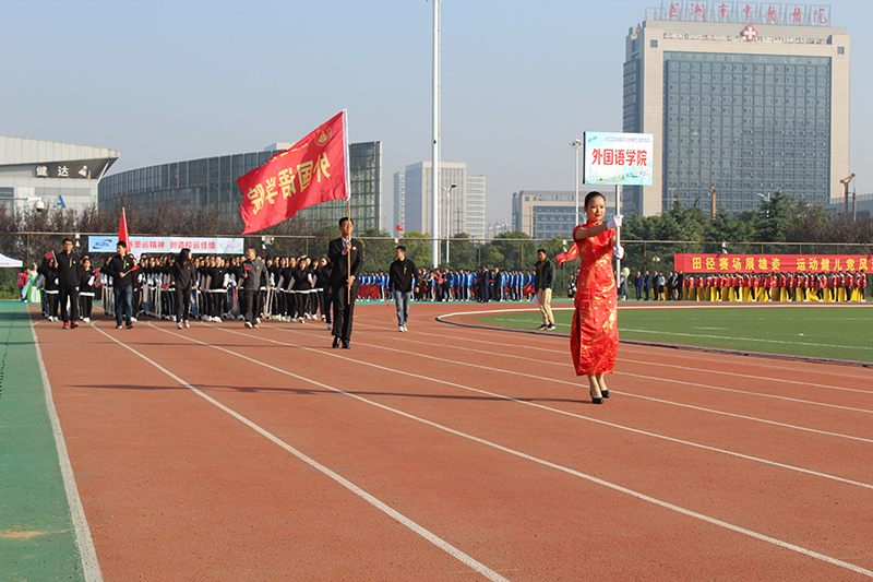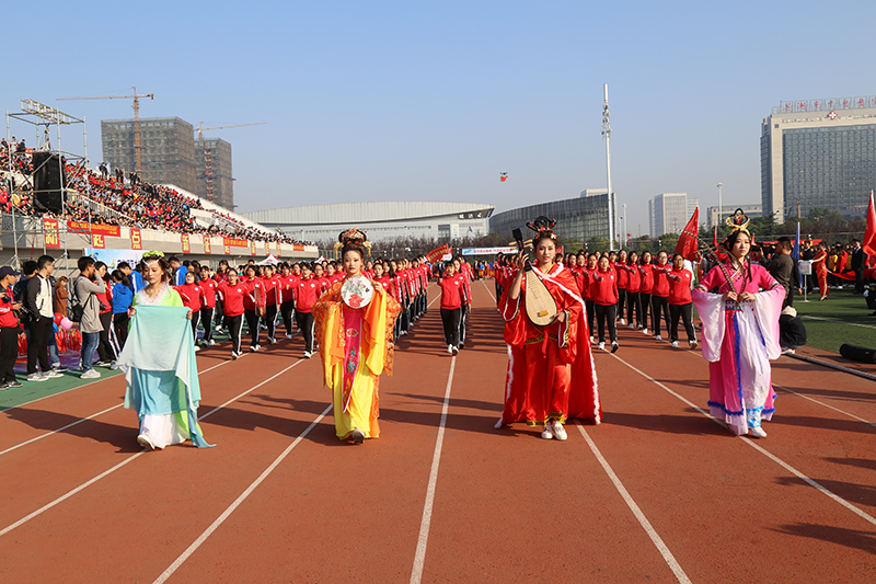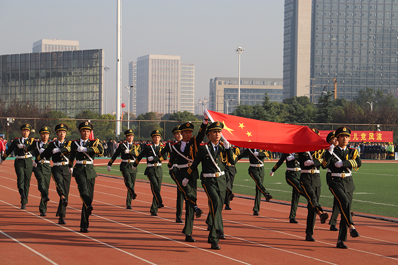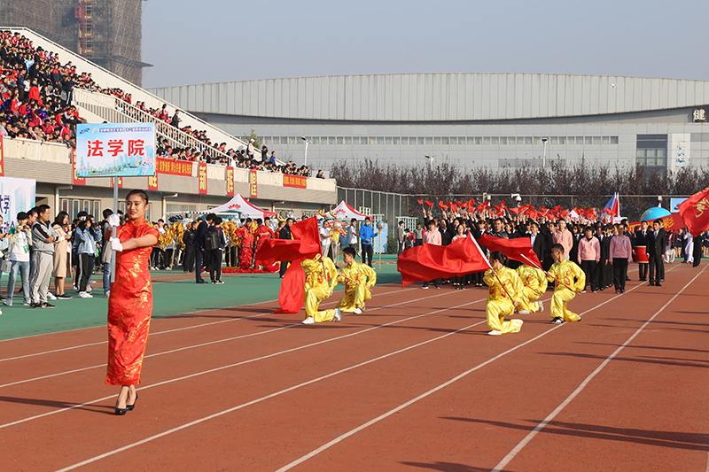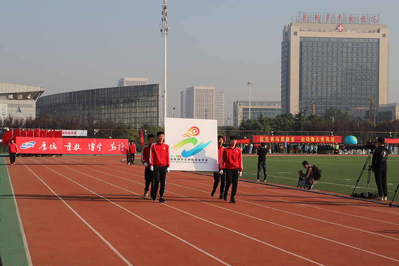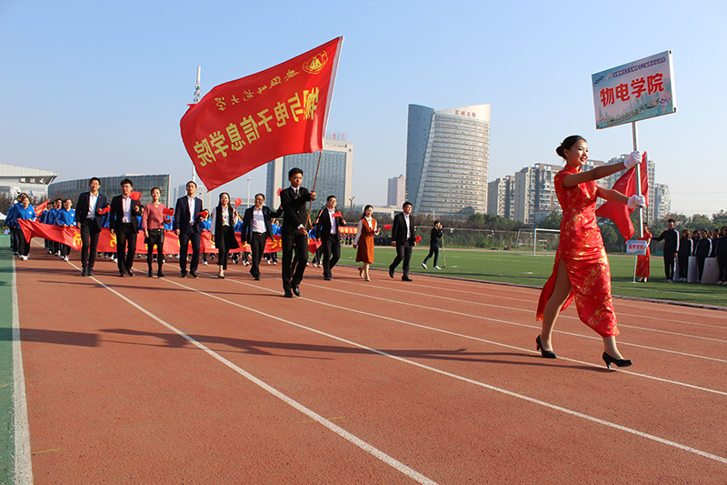 上午8时,迎着十月煦暖的阳光,伴随着激情昂扬的乐声,国旗、校旗、五色彩旗迎风飘扬,全校各个学院按既定顺序有序入场。红旗方阵身着肃穆军装,气宇轩昂。他们守护着庄严的国旗与校旗,迈着庄重的步子首先进入会场。法学院身着正装,以严谨与精睿的气质,掷地有声的口号,表达了为国之法未来征程不懈努力的信心;国际教育学院的留学生们以别样风貌展示着多元化风采,突出了独特的学院文化,也彰显着各国共同追求体育精神的国际理念;国土资源与旅游学院身着勘测服,手顶地球仪,体现出锐意进取、开拓创新的学院精神;化学与材料科学学院的学子们英姿勃发,点点青春光华,澎湃少年豪情;环境科学与工程学院由吉祥物安安和康康引领方正队,寓意环保地球,绿色生态的历代学院理念;教育科学学院身着黑色西装,手持粉色气球,展示着学院理念与青春活力的交融;经济管理学院身穿黑色正装,整齐的步伐与队形变换展示出了他们的理性与严谨;历史与社会学院身着古朴侠士服,手提灯笼,体现了研究古文化的钻研精神;美术学院带来一段活力四射的健美操表演,展现了他们活力健美的风貌;生命科学学院身着白穿外褂,踏着青春的节拍,体现了他们的奋发向上精神和钻研科学的决心;数学计算机科学学院身穿红色院服,他们步伐从容自信,体现了对数计的不懈追求;体育学院的学生精神饱满,气宇轩昂,体现了运动健儿的运动精神与体院风采;外国语学院别出心裁,充分彰显专业特色,用中英俄日法德五种语言展示“我们最棒”;文学院身着古式服装,缓缓走来,呈汉唐遗风,展今世风貌;物理与电子信息学院迈着坚定有力的步伐,体现了学院学子蓬勃向上的豪气英姿与学院精神;四只疯狂动物园里的小动物闯进了新闻与传播学院的方阵队里,以鲜亮的的橙色院服,独具特色的队伍设计,将观众们的热情点燃,推动气氛达到高潮;音乐学院敲打腰鼓,让音乐与体育碰撞出了激情昂扬的火花;马克思主义学院以“19”的队形来庆祝祖国十九大盛会,灿烂的微笑彰显着他们的无限热情与青春活力……18个学院的方阵队伍各具风采,伴随着洪亮的口号,他们踏着整齐的步伐依次走过主席台前,接受检阅。