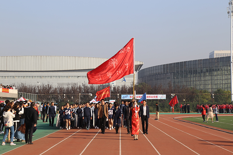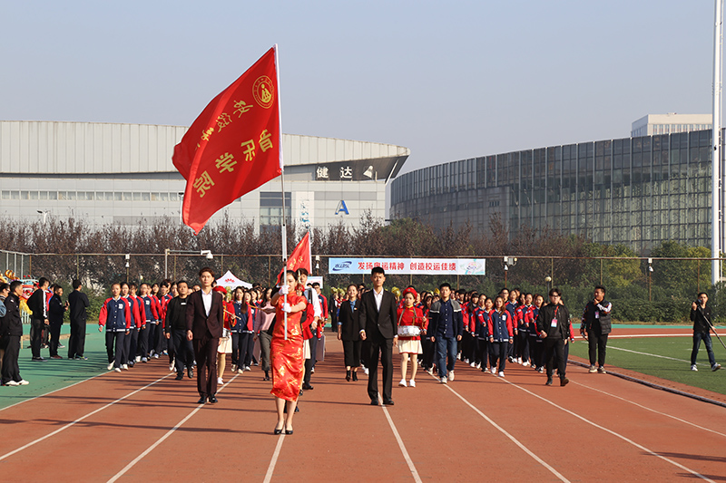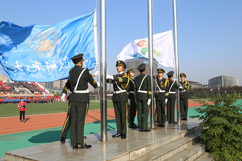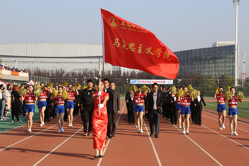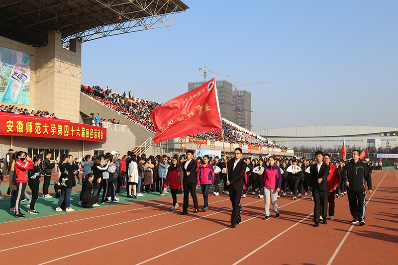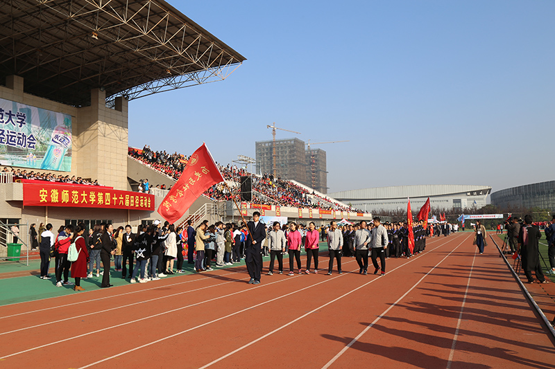 伴随着国歌、校歌,国旗、校旗、会旗先后升起。张庆亮在致辞中指出,十九大中习近平总书记提出“广泛开展全民健身活动,加快推进体育强国建设”的宏伟目标。体育是高等学校教育事业的重要组成部分,在校党委的高度重视和全校师生的共同努力下,我校田径运动会已经成功举办了45届,积极促进了学校体育事业、特别是体育人才培养工作的长足进步。一年来,学校新成立了足球学院,将体育改革纳入学校发展改革中统筹推进,我校体育健儿在国际、国内体育赛场上屡创辉煌,我校学子在2017全国啦啦操标赛上获得两项冠军,在中国第六届体育舞蹈公开赛上获得两项冠军,在安徽省大学生乒乓球比赛中获得三项冠军、两项亚军,在安徽省大学生羽毛球比赛中获得三项冠军。尤其是在2017年全国运动会上,王春雨同学获得女子800米金牌,丁嘉伟同学获男子10米气步枪铜牌,徐世元、周雪婷两位同学获女子手球银牌,白传涛同学获男子80公斤级跆拳道铜牌……为安徽省代表团赢得了荣誉,为师大增添了光彩。