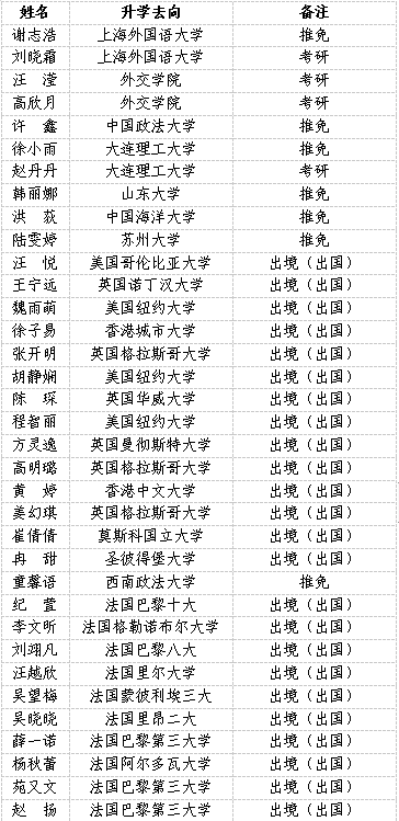 “强化指导、适时引导、主动疏导的就业指导模式,开展就业宣传教育系列活动,举办简历设计大赛、模拟招聘会、培训报考选调生等。从就业指导、心理辅导等方面定期与学生进行帮扶交流,今年学院毕业生毕业去向落率为92.86%,获评校就业先进学院。有75名学生进入哥伦比亚大学、波士顿大学、巴黎三大、莫斯科国立大学、外交学院、上海外国语大学等世界及国内名校学习,达到了我们的预期目标。”外国语学院党委副书记杨一飞说。