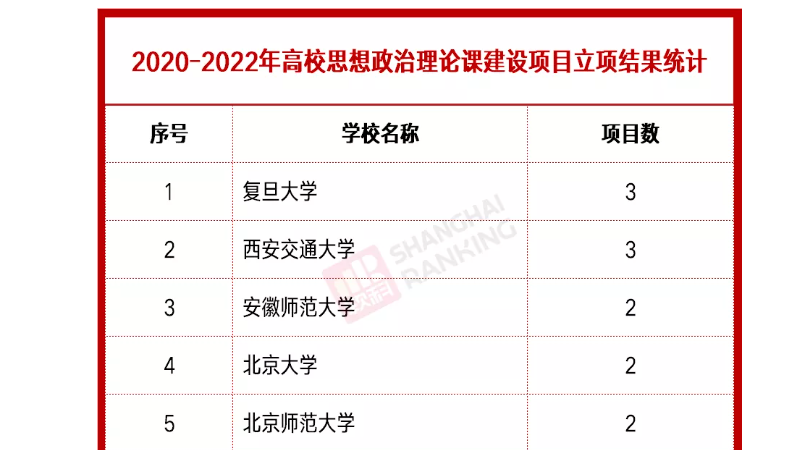 据统计,在此次立项项目中复旦大学、西安交通大学立项数均为3项,并列第一;安徽师范大学、北京大学、北京师范大学等24所高校立项数为2项。