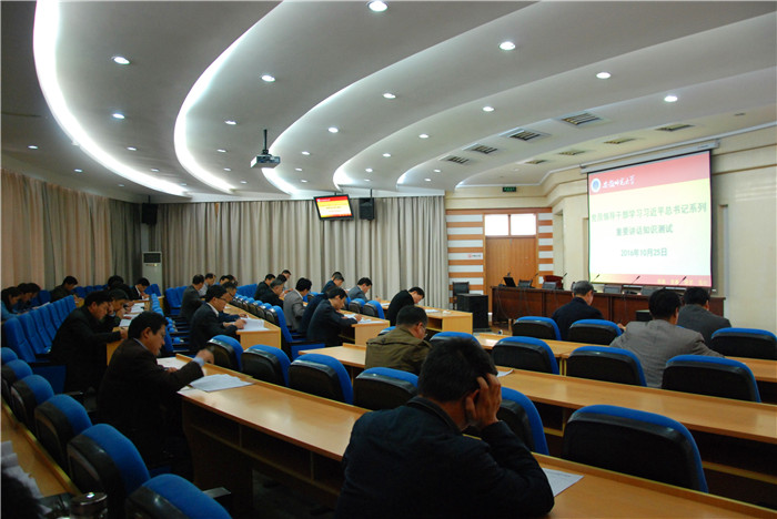 ,学校在花津校区财务处二楼报告厅和视频会议室开展习近平总书记系列重要讲话知识集中测试,校领导和学校中层党员领导干部200余人参加了集中测试。
