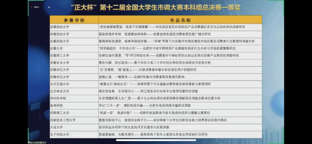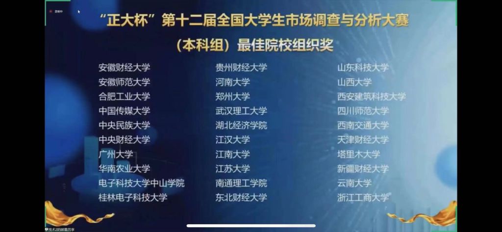 5月28-29日,“正大杯”第十二届全国大学生市场调查与分析大赛圆满落幕。经过省赛及复赛的层层选拔,全国共有211支队伍进入本科生组总决赛,安徽省共有14支团队入围本次决赛。由2019级数学与应用数学(师范类)拔尖班学生王小如、沈昃莹、石子怡、杨昕、2019级金融工程专业学生杨媛媛组成的网易云音乐队,由2019级数学与应用数学(师范类)拔尖班学生刘焱楠、2019级计算机科学与技术专业学生陈奇、2019级经济学专业学生闻欢、盛燕、2019级金融工程专业学生何跃敏组成的林海奔啼队双双荣获第十二届全国大学生市场调查与分析大赛国家一等奖,这是我校在该赛事首次同时获得两个国家级一等奖,同时,也是我校第四次荣获最佳组织奖。