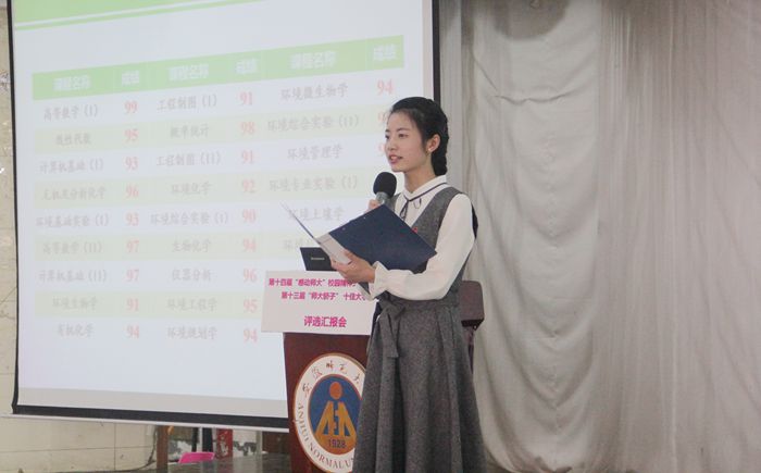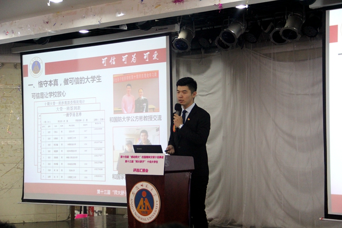 评选汇报按照抽签顺序以图文展演形式进行,每项汇报限时5分钟。在“十佳事迹”评选中,17个候选项目负责教师分别进行了汇报分享。舞台实践志愿服务、幼儿环保教育活动、敬老爱老志愿服务等一件件绽放精神文明之花、彰显师大青年责任担当故事,赢得了现场观众的阵阵掌声。在“十佳大学生”评选中,来自17个学院的20名同学围绕“梦想”“成长”“责任”等关键词,登台讲述自己在大学生活中筑梦追梦的青春故事。他们,当中有全面发展、专业突出的团学骨干,有成绩优异、直博北大的学习标兵,有专业突出、作品在国内外出版的漫画达人,有妙手著文、将爱好变成未来专业的校园记者,有风雨无阻、志愿服务西部山区的支教先锋……汇报会成了一场青春励志会、经验交流会、成长报告会,感染着在场的每一位师生,不时爆发出热烈的掌声。