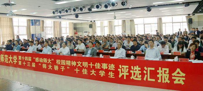 青通社讯(记者 杨文静 高 远)5月6日,学校举行第14届“感动师大”校园精神文明十佳事迹暨第13届“师大骄子”十佳大学生评选汇报会。评审委员会主任、校党委副书记李琳琦,评审委员会全体成员,各学院分管领导、专业负责人代表、团委负责人、辅导员及学生代表近300人参加会议。