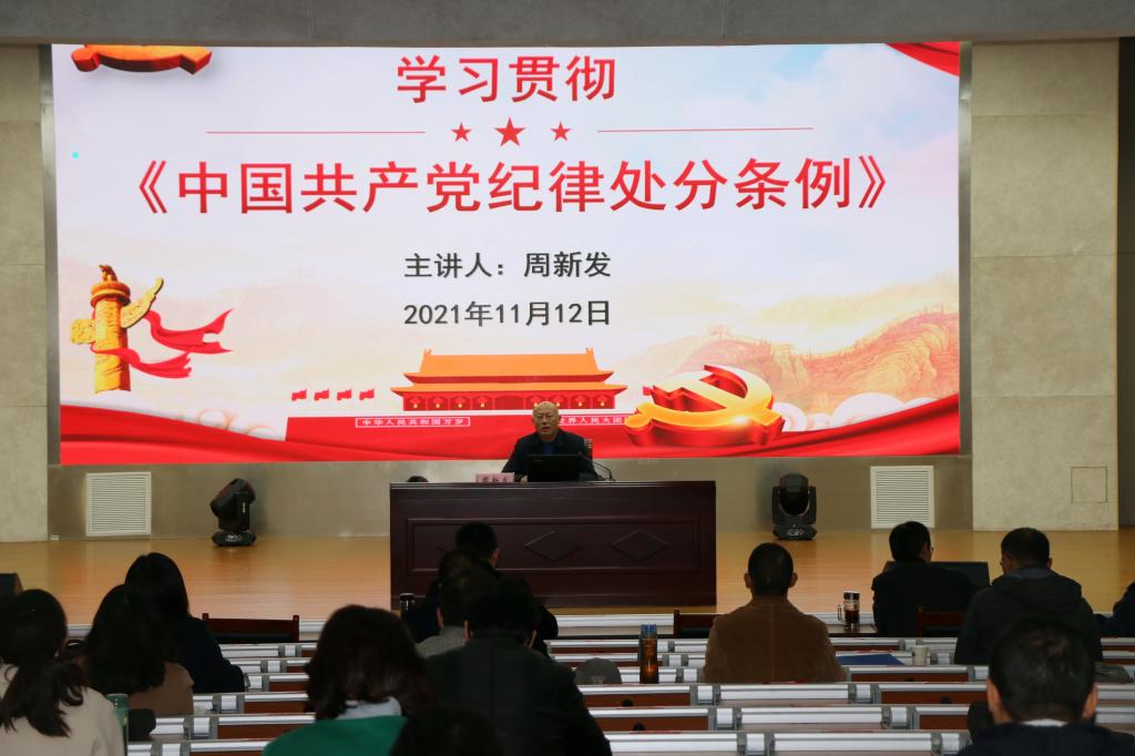 本网讯(组织部)11月12日,校党委常委、纪委书记、监察专员周新发在花津校区实习实训中心报告厅为教职工党支部书记能力提升培训班作学习贯彻《中国共产党纪律处分条例》(以下简称《条例》)辅导报告。全校教职工党支部书记、组织员、党委秘书参加了报告会,报告会由党委组织部副部长余妍霞主持。