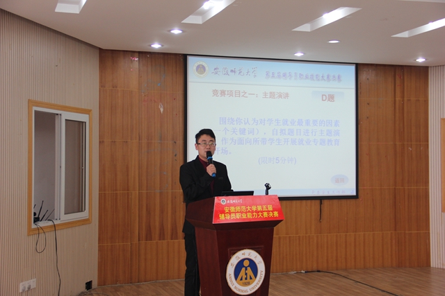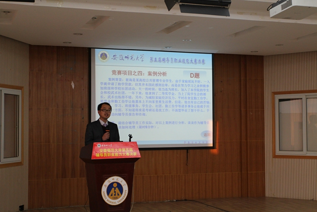 决赛包括主题演讲、谈心谈话、主题班会现场展示、班情熟知和案例分析共5个环节。10名进入决赛的辅导员以敏捷的思维、扎实的知识、精彩的表现赢得了大家的一致认可。最终,经专家评委评选,新闻与传播学院辅导员郁悦和数学计算机科学学院辅导员李妍获得大赛特等奖,环境科学与工程学院辅导员童华卿等4人获得一等奖,历史与社会学院辅导员宫超等4人获得二等奖,文学院辅导员李震等10人获得三等奖,化学与材料科学学院等8个学院获得优胜杯。比赛结束后,校科研处副处长、马克思主义学院博士生导师戴兆国教授对决赛逐项进行了点评,充分肯定了参赛辅导员的职业素养,同时对辅导员如何在全省和全国的参赛中取得优异成绩提出了宝贵建议。