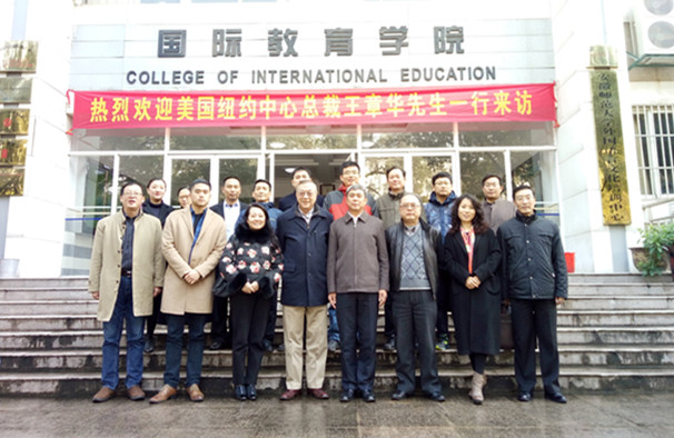 本网讯 (国际教育学院 李一鸣)11月24日,美国纽约中心总裁王章华先生一行访问我校。朱家存副校长亲切会见代表团成员。参加会见的有教务处处长席贻龙、继续教育学院院长胡金戈、数计学院院长任永、音乐学院院长张建华、经管学院院长周端明、外办副主任刘东合、国旅学院副院长方凤满、化材学院副院长张小俊和生科院生命科学专业负责人陈明林。