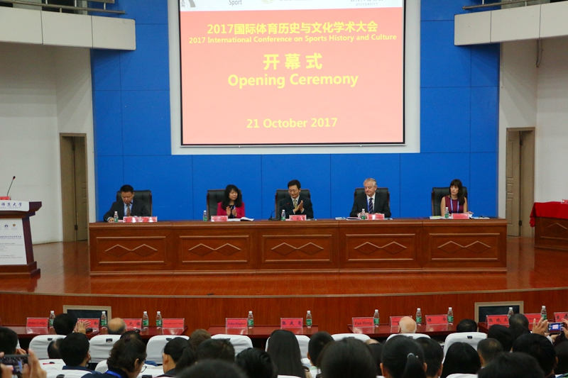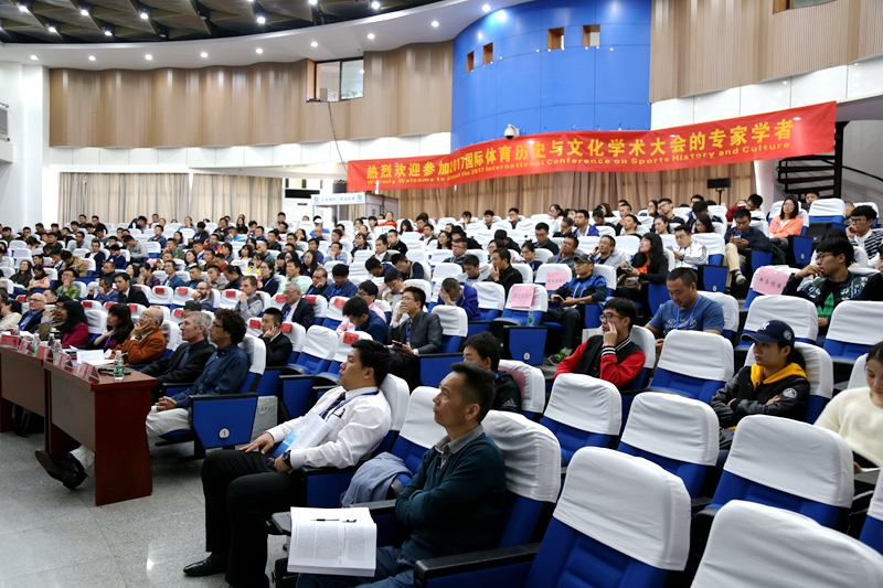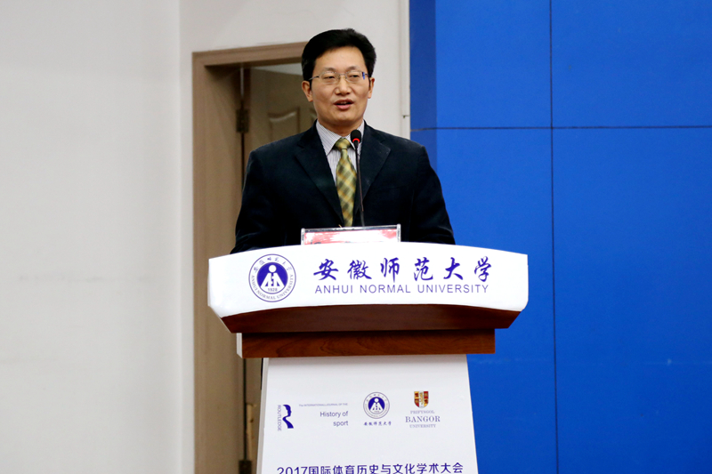本网讯(体育学院 张瑾/文 孙昊/图)为促进中外学者研究亚洲各国或各地区民族传统体育文化的学术交流与讨论,10月21日上午,2017国际体育历史与文化学术大会“全球化与民族化:亚洲民族传统体育文化的传承与发展”在我校敬文图书馆学术报告厅举行。安徽师范大学校长张庆亮教授、英国Bangor大学校长John Hughes教授、《国际体育史》期刊主编凡红教授,Routledge出版集团体育期刊部负责人Alejandra Leach-Nunez等国内外200余名专家学者出席了开幕式,开幕式由体育学院院长席玉宝教授主持。