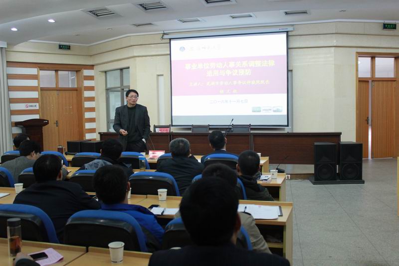 培训中,胡义权从在编人员人事关系和非在编人员劳动关系调整适用的法律条文等两个角度出发,对《劳动法》、《劳动合同法》、《事业单位人事管理条例》等10多个法律条文或相关规定进行了详细的解读。随后,他结合案例,对事业单位劳动人事关系调整的热点问题进行了深入分析,从专业角度对学校依法调整劳动人事关系提出了建议。