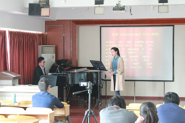 本网讯(教务处本科教学督导团)4月13日下午,在赭山校区音乐学院多功能厅,音乐学院戴剑武副教授主讲了《声乐演唱-意大利古典艺术歌曲语音与演唱》示范观摩课。校督导团、教务处和学院领导以及部分师生参加了此次教学观摩活动。