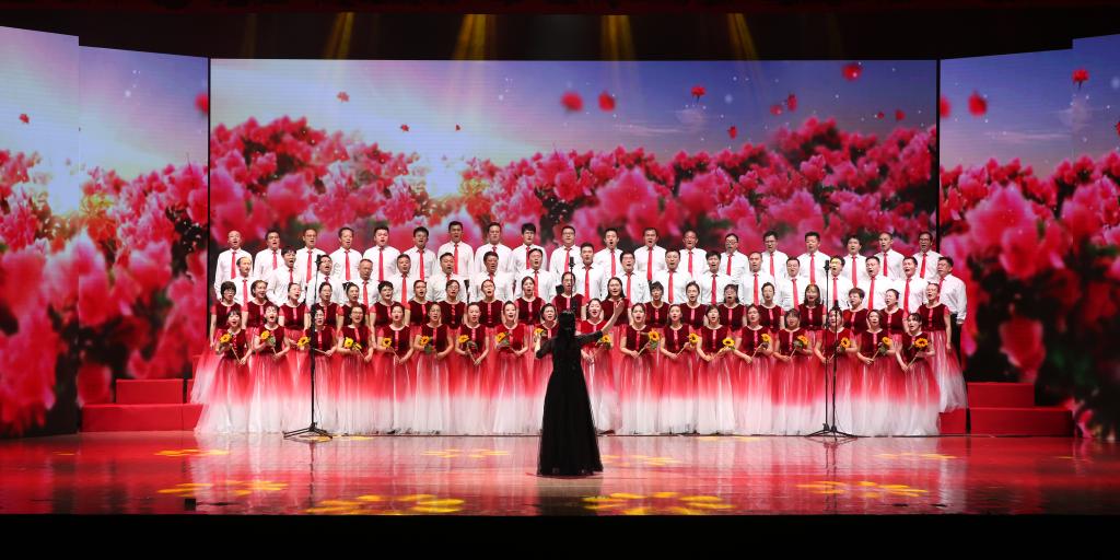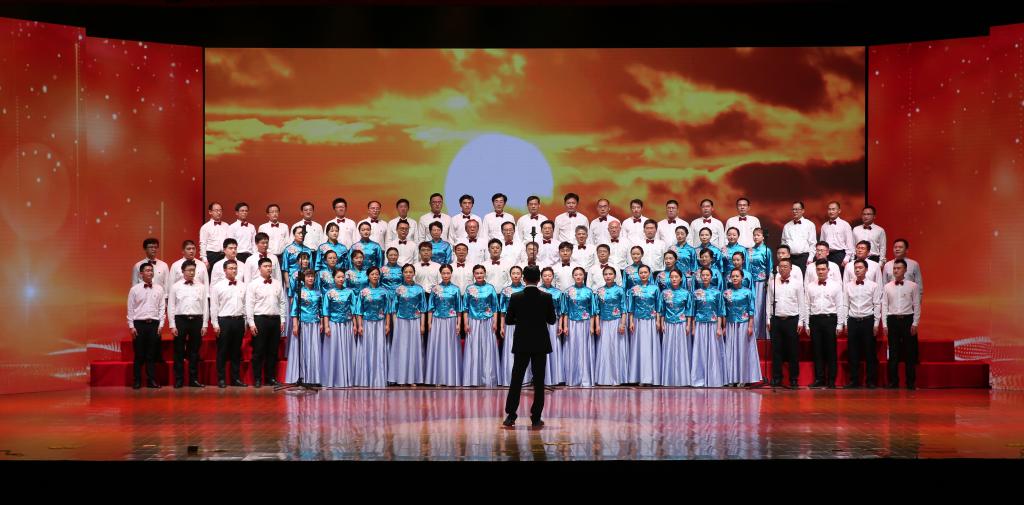 第二个篇章“改天换地”。那是一段激情燃烧的岁月,更是一个火红的年代。在戈壁荒滩、在崇山峻岭,默默无闻,埋头苦干的共和国先驱,奏响了无私奉献的时代最强音。地旅学院、生态与环境学院、美术学院、生科院、总务、计信学院合唱队分别演唱了歌曲《我的祖国》《我们走在大路上》《在希望的田野上》《祖国不会忘记》《我的中国心》《中国、中国鲜红的太阳永不落》,广大教职工把对党和国家的热爱融入到美妙的歌声中,唱出了激情、唱出了力量、唱出了干劲,展现了我校教职工斗志昂扬、奋发有为、蓬勃向上的精神风貌。