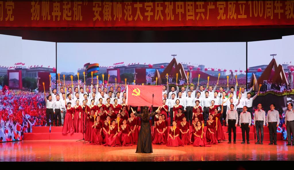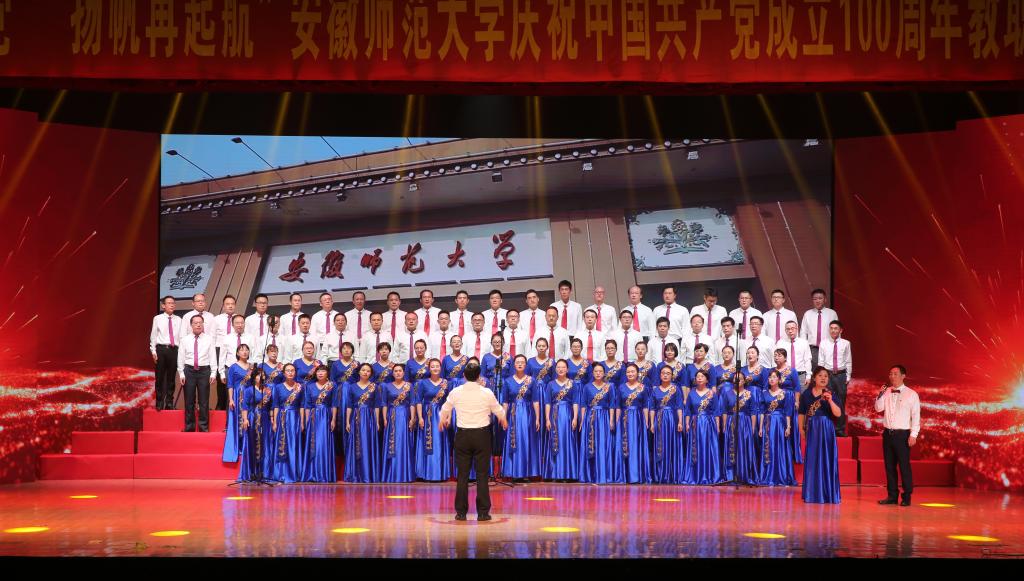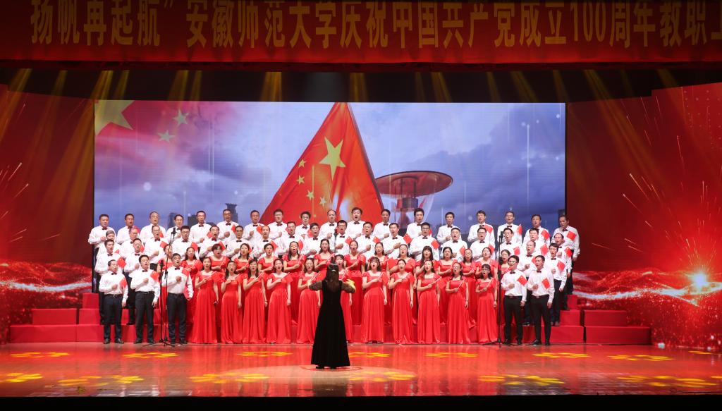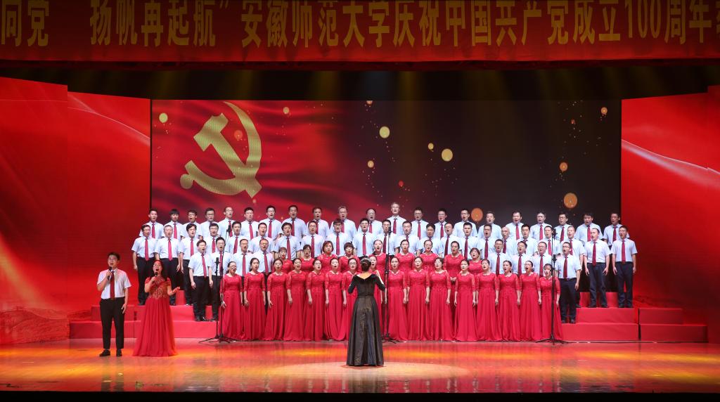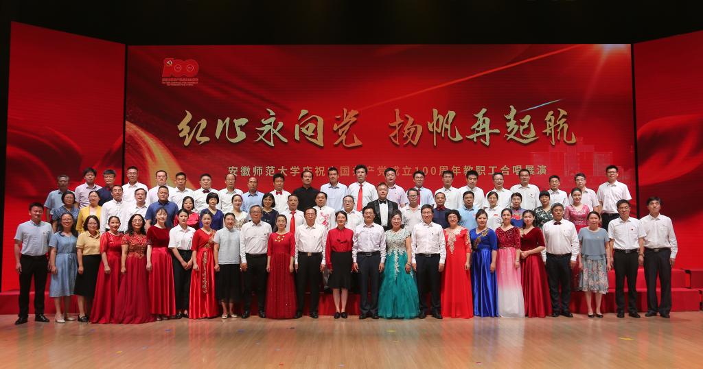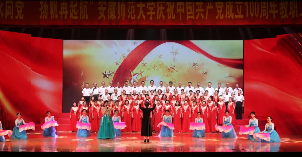 本网讯(党委宣传部 王哲谦)奋斗百年路,踏歌新征程。6月30日下午,安徽师范大学“红心永向党·扬帆再起航”庆祝中国共产党成立100周年教职工合唱展演在花津校区大礼堂举行。全校24支合唱队1500余名教职工放声高歌,回顾党的光辉历史,歌颂英雄人民,歌唱瑰丽山河,尽情抒发对党的忠诚热爱,现场融成一片红歌的海洋,不断汇聚砥砺前行的强大力量。校领导胡朝荣、张庆亮、蒋家平、陆林、彭凤莲、周新发、熊宇杰参加了机关合唱队。